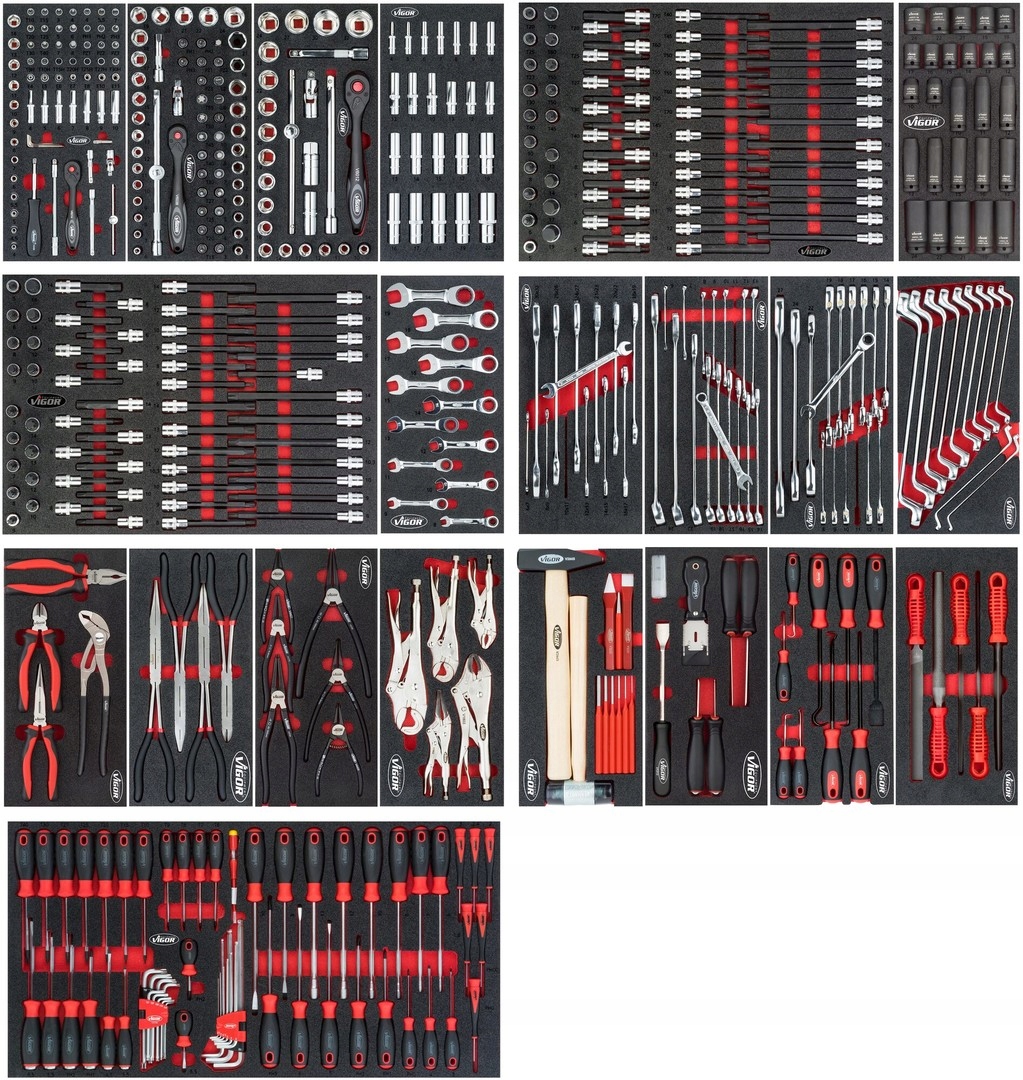 В комплект с тележкой входит 21 пенопластовый модуль с инструментами. которые помещаются в 7 ящиков: