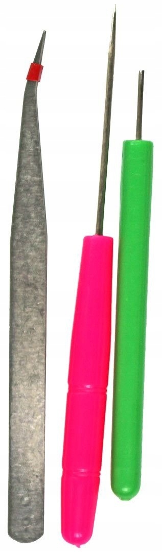 Набор инструментов для квиллинга, состоящий из иглы длиной 11 см с пластиковой ручкой, шпажки длиной 14 см и металлического пинцета с загнутым кончиком длиной 13,2 см.