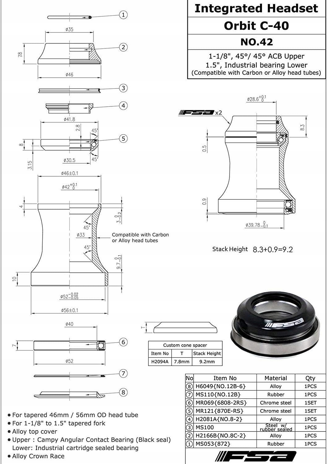 интегрированная орбита FSA C-40 конусная нет. 42