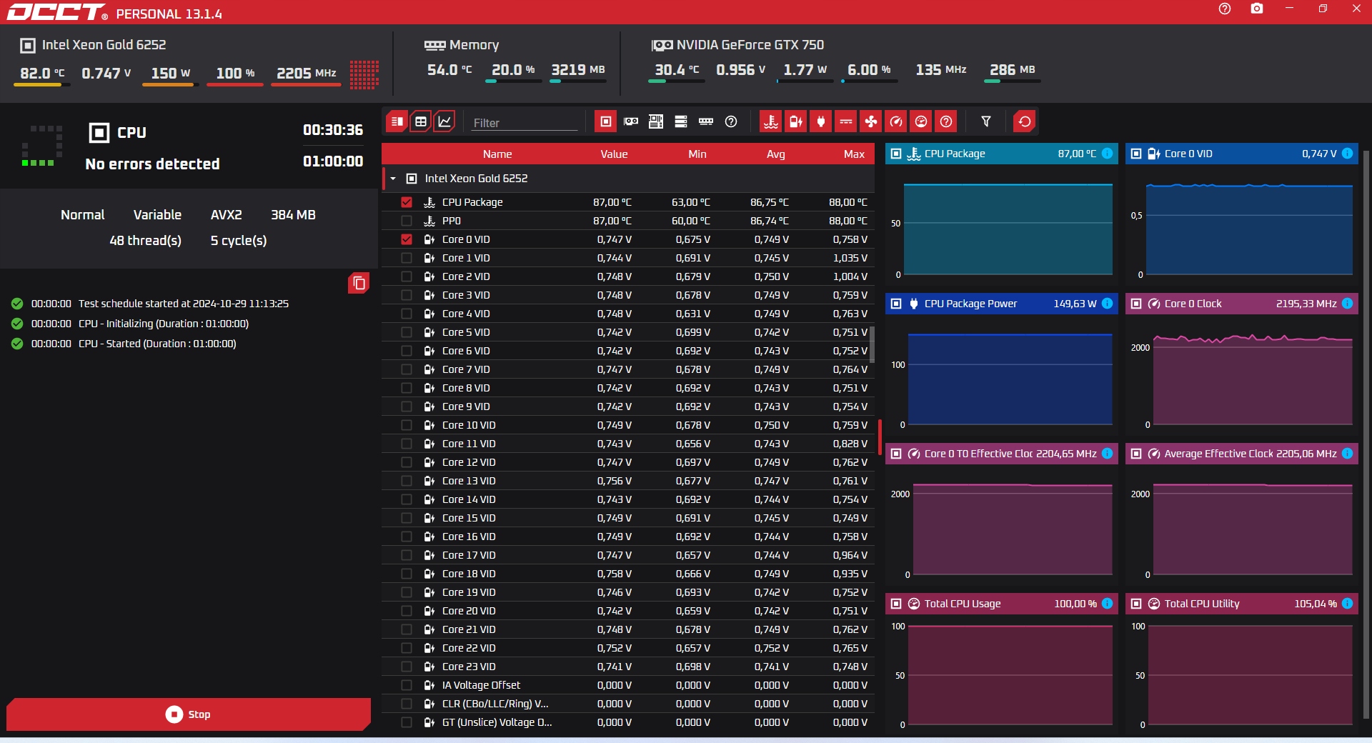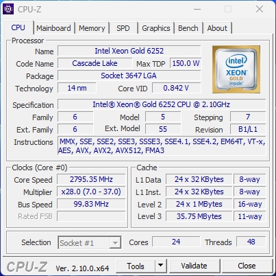 Intel Xeon Gold 6252 работает с базовой частотой 2,1 ГГц, что благодаря технологии Intel Turbo Boost может увеличиться до 3,7 ГГц, что позволяет динамическая регулировка производительности в зависимости от нагрузки. Процессор поддерживает 24 ядра и 48 потоков, что обеспечивает чрезвычайно эффективную многоцелевую и эффективную поддержку для интенсивных нагрузок сервера. Благодаря 35,75 МБ памяти Cache L3, устройство предлагает быстрый доступ к данным, что значительно повышает эффективность приложений, требующих высокой вычислительной мощности.