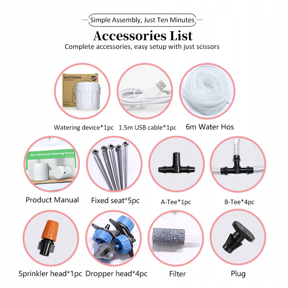 1. Система полива для более чем 5 горшечных растений: интеллектуальная система распыления и капельная ирригационная система с 1 посыпкой головкой, 4 капельными головками, 5 фиксированного сиденья, 5 T -мала и водяная змея 6 м/ 19,7 фута. Полный набор для полива 5+ горшечных растений.