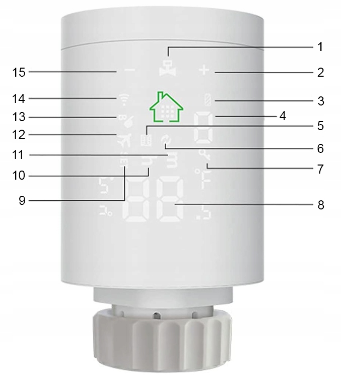 <р>1. Кнопка управления клапаном (открыть/закрыть) <р>2. Кнопка увеличения <р>3. Индикатор низкого заряда батареи (также уведомляет вас в мобильном приложении) <р>4. Число, обозначающее текущий дневной цикл, для которого установлена определенная температура. <р>5. Обнаружение открытого окна <р>6. Автоматический режим - позволяет определить график изменения температуры в рабочие и праздничные дни.7. Блокировка экрана, например, от детей