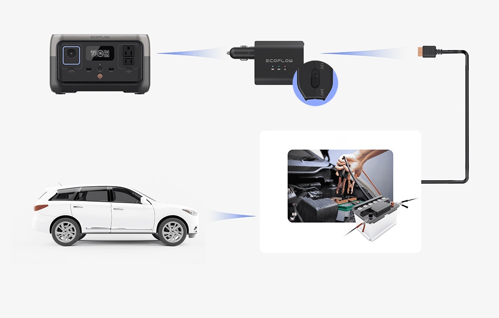 Это практичное зарядное устройство работает в сочетании с электростанциями серии DELTA или RIVER. Чтобы зарядить аккумулятор вашего автомобиля, выберите подходящее напряжение (12 В или 24 В), а затем подключите прилагаемые кабели XT60. Следующий шаг – подключение зарядного устройства к станции. Тогда просто подождите, пока аккумулятор автомобиля зарядится! Но это еще не все. С помощью зарядного устройства вы также можете зарядить РЕКУ или ДЕЛЬТУ от прикуривателя автомобиля - таким образом вы обеспечите питанием необходимые устройства во время путешествия.