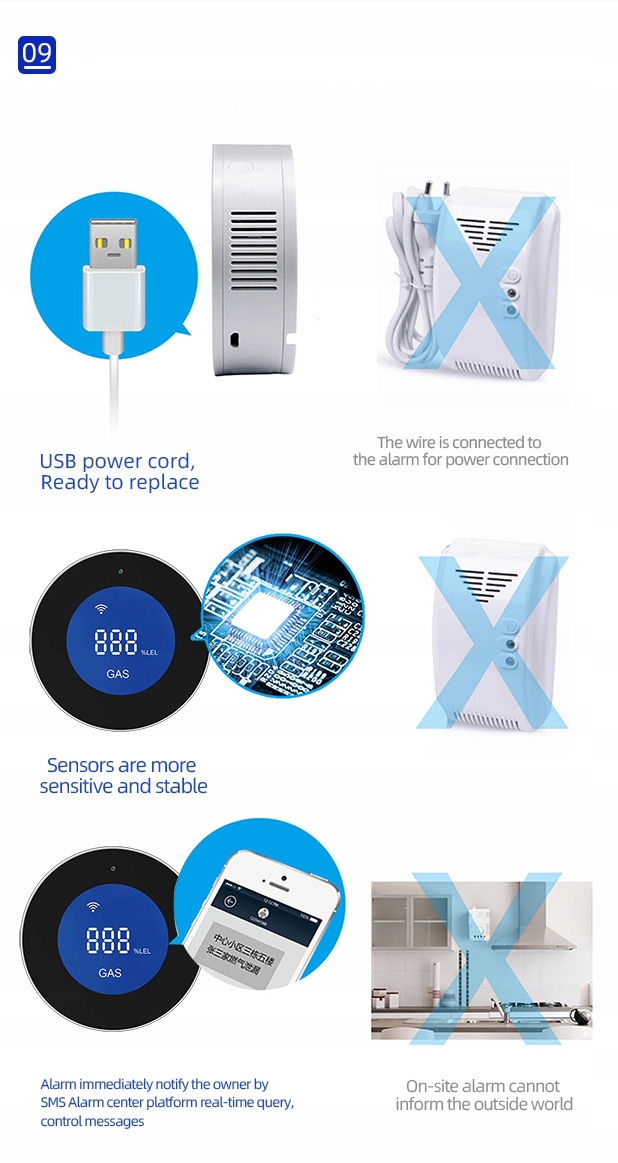 Работа напрямую от сети 220 В со стандартной вилкой — сложная проводка не требуется. Сигнал тревоги автоматически срабатывает при 8% и сбрасывается, как только уровни нормализуются. Простая замена шнура питания USB продлевает срок службы.