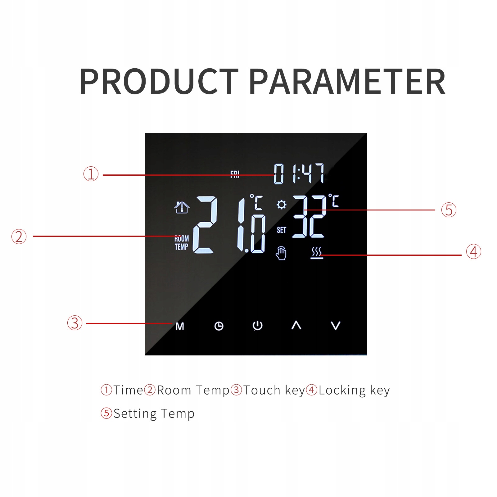 4. Детальная температура: датчик внутреннего пола, температура ощущения окружающей среды и температура пола \ u0027s. Автоматически получают температуру, точность 1 ° C.