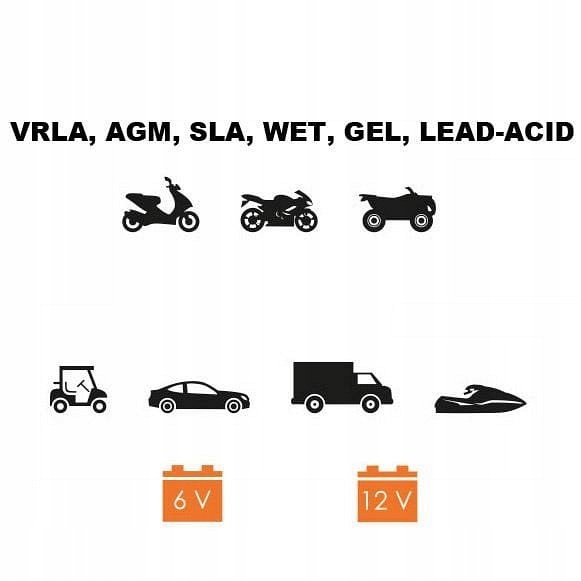 Подходит для зарядки многих типов аккумуляторов как в скутерах, мотоциклах, квадроциклах, так и для зарядки аккумуляторов автомобилей и автобусов. Заряжает аккумуляторы напряжением 6 В и 12 В.