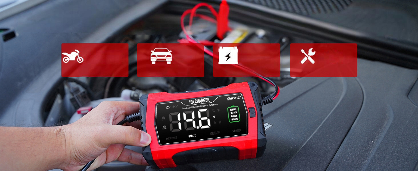 【12 V/24 V battery charger】 The car charger is suitable for 12 V and 24 V lithium batteries, Lifepo4, acid-noble (AGM, Gel, EFB, SLA, Flooded, wet, wet, wet, wet, wet, wet, wet, wet, wet, wet, мокрый, влажный, влажный). Рекомендуемая мощность составляет 6AH -120AH, чем выше пропускная способность, более длительное время зарядки, максимальный ток зарядки до 10AH для батареи 12 В и 5AH для батареи 24 В.