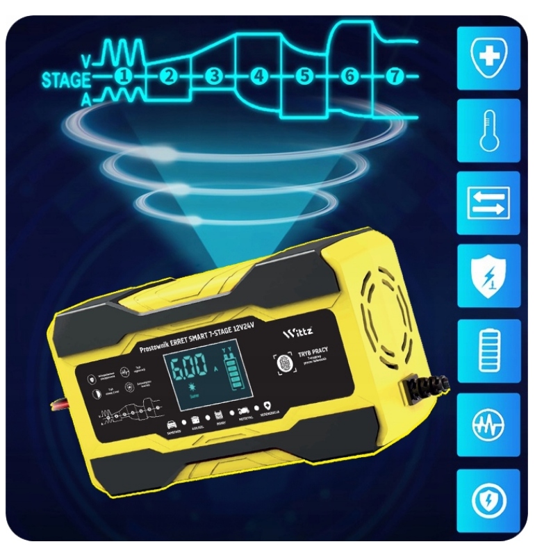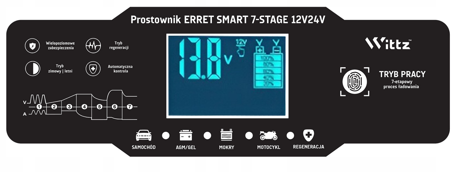 Выпрямитель, создавая ток до 10А, обеспечивает быструю зарядку каждого аккумулятора напряжением 12В и 24В.Польские надписи на лицевой стороне панели облегчают работу, что повышает комфорт использования.< /п>