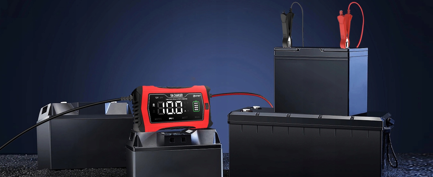 【Зарядное устройство для аккумуляторов 12 В/24 В】Автомобильное зарядное устройство подходит для литиевых, LiFePo4, свинцово-кислотных (AGM, GEL, EFB, SLA, залитых, влажных и т. д.) аккумуляторов напряжением 12 В и 24 В. Рекомендуемая емкость составляет 6–120 Ач. Чем выше емкость, тем дольше время зарядки. Максимальный зарядный ток до 10 Ач для аккумулятора 12 В и 5 Ач для аккумулятора 24 В.