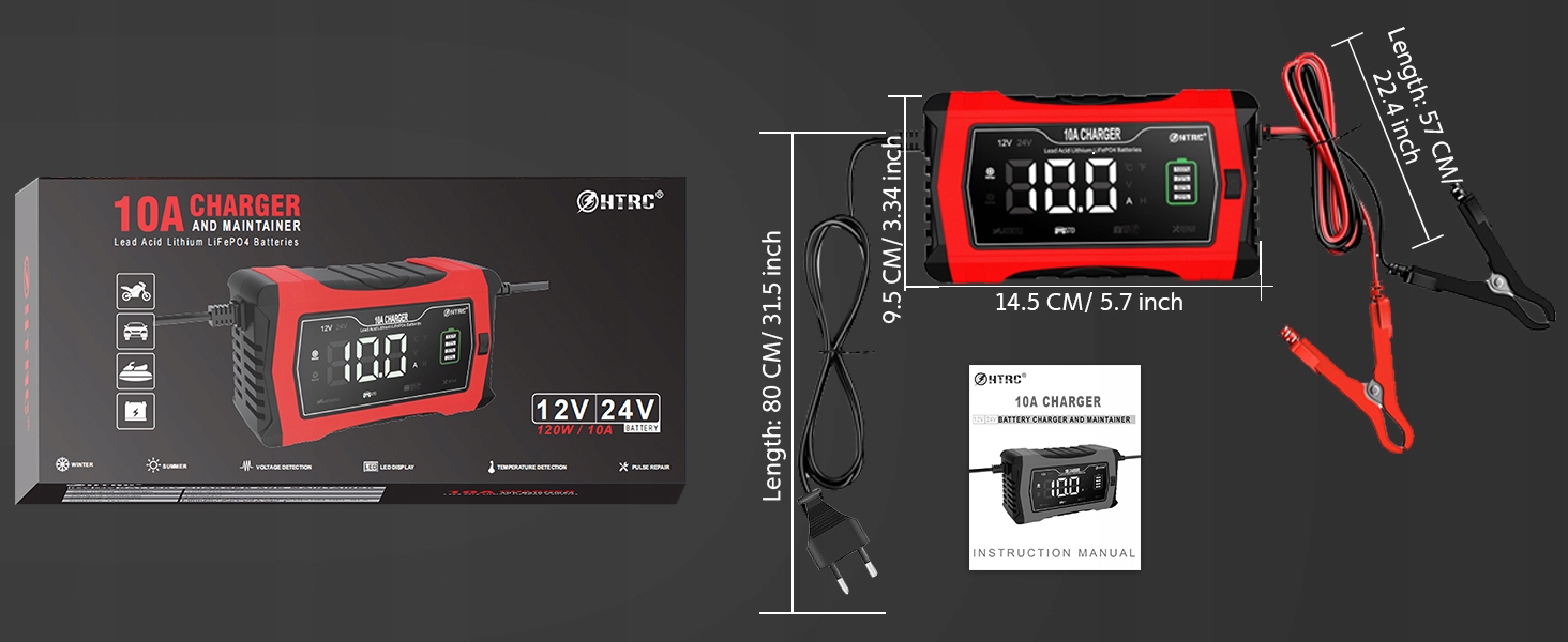 【Что вы получаете】1 зарядное устройство 12 В/24 В с кабелем питания длиной 80 см и длиной 57 см кабель с зажимом «крокодил», 1 руководство пользователя.