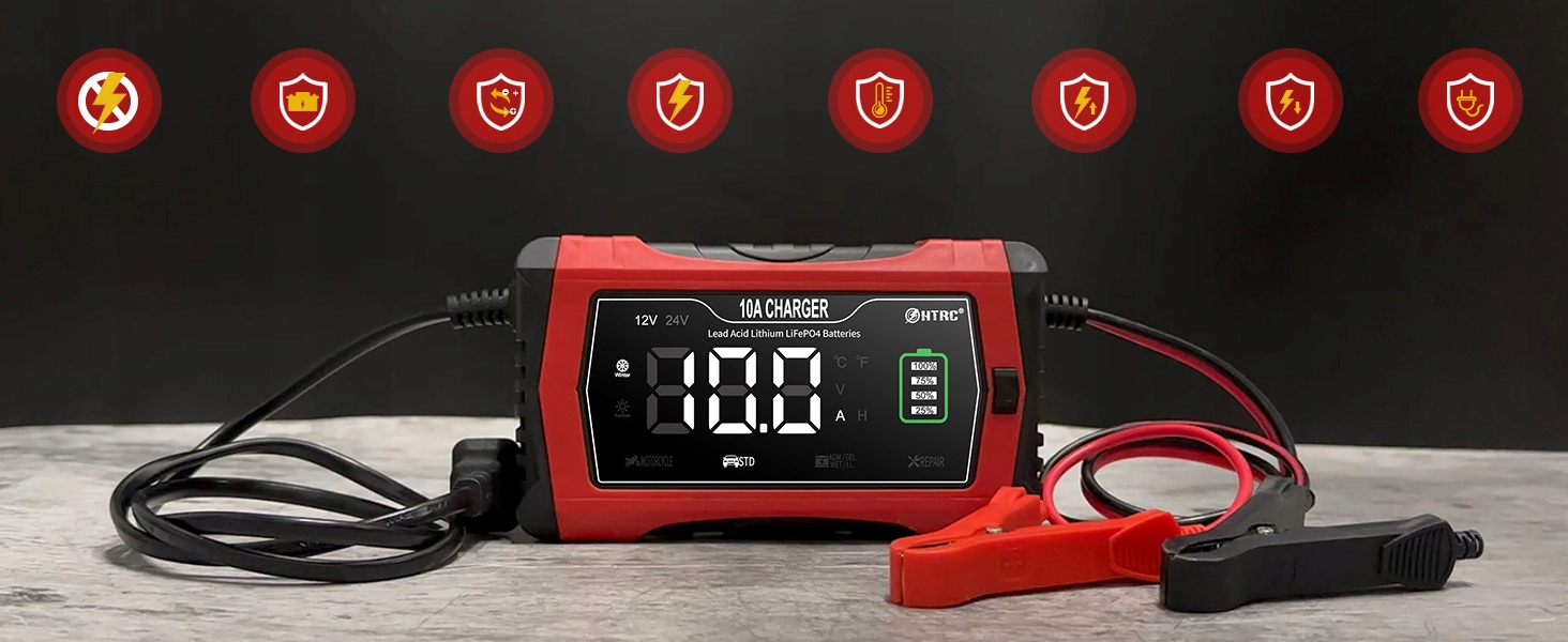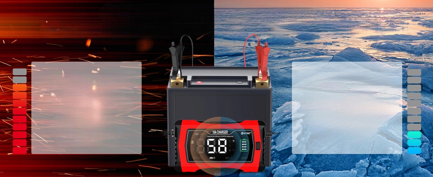 【Умная и безопасная зарядка】Автомобильное зарядное устройство на 12 В заряжается быстрее. Он предлагает различные программы зарядки, адаптированные к различным характеристикам аккумулятора, и отлично сохраняет аккумулятор. Функция импульсной регенерации позволяет регенерировать старые и неиспользованные батарейки. (Не касается серьезно поврежденных аккумуляторов) Автоматический выбор зимнего и летнего режима предотвращает перезаряд и недозаряд. Встроенный интеллектуальный чип и эффективная схема обеспечивают защиту от перезаряда, перегрузки по току, перенапряжения, обратной полярности, короткого замыкания и перегрева. Корпус изготовлен из огнеупорного материала, безопасен и надежен.