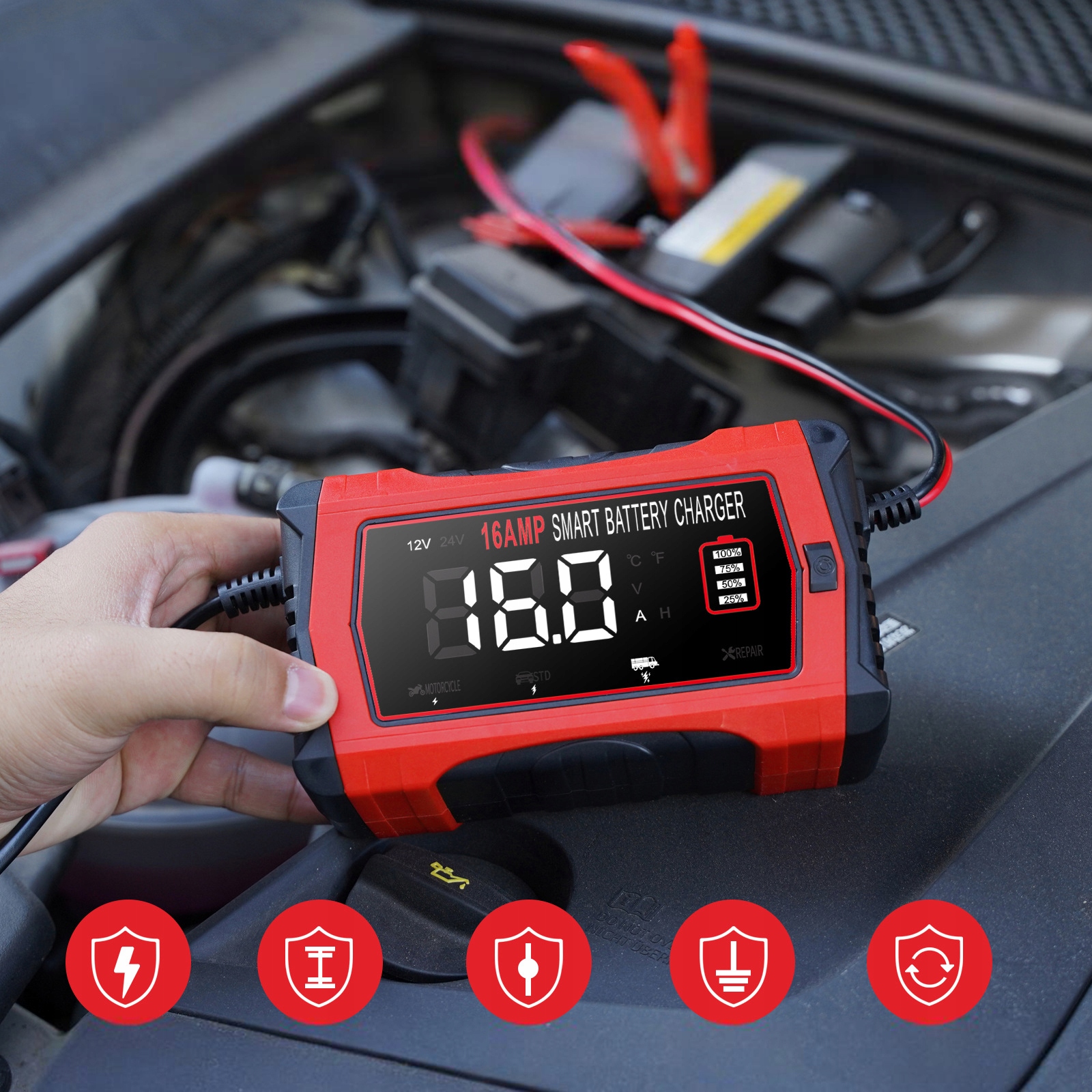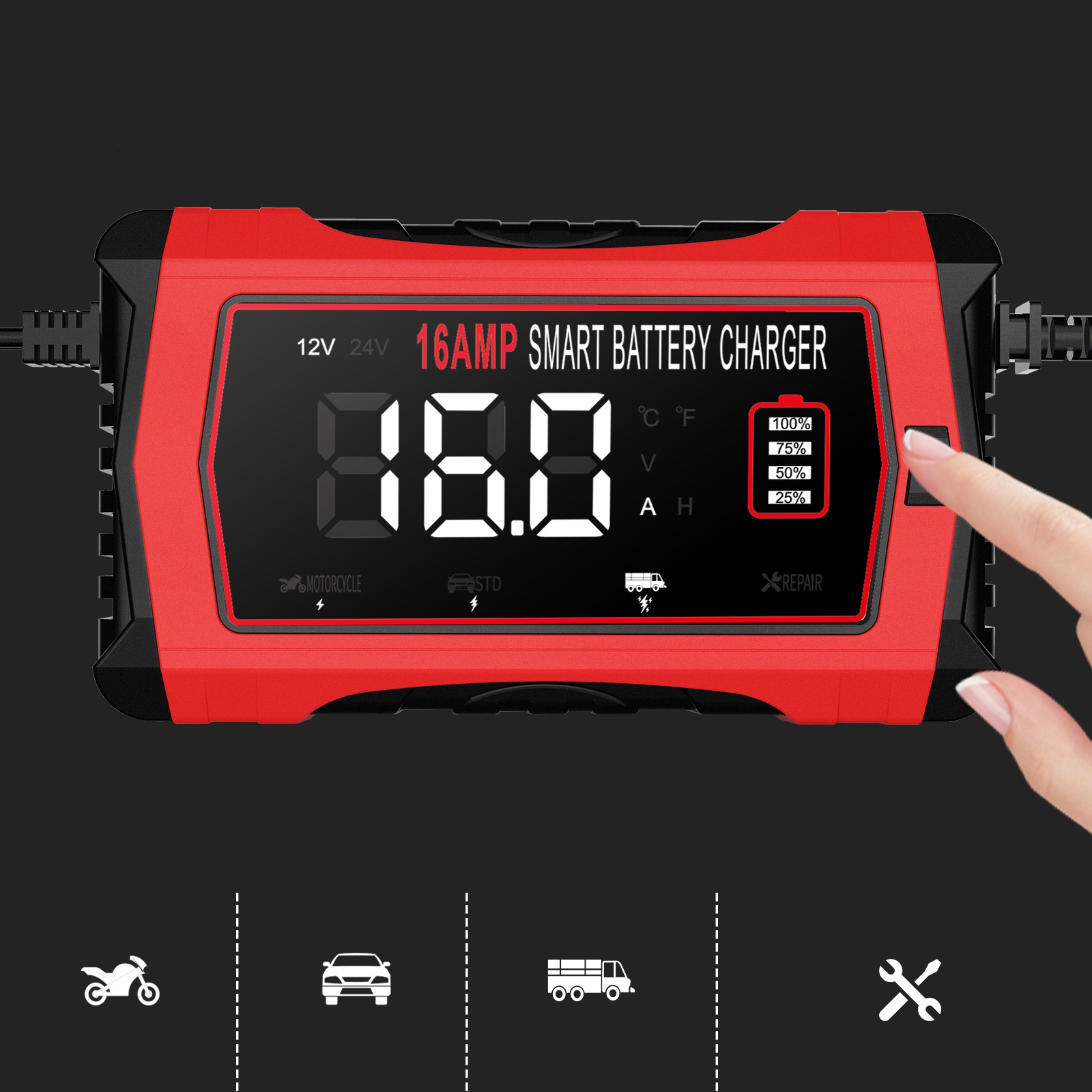 【Автомобильное зарядное устройство 16А】Это автомобильное зарядное устройство подходит только для свинцово-кислотных аккумуляторов 6 В/5 А, 12 В/16 А и 24 В/10 А (AGM, кальциевые, гелевые, MF, EFB, SLA, VRLA, влажные), литиевых. аккумуляторы и аккумуляторы LiFePO4. Оно широко используется для безопасной и эффективной зарядки автомобилей, мотоциклов, лодок, газонокосилок и т. д.