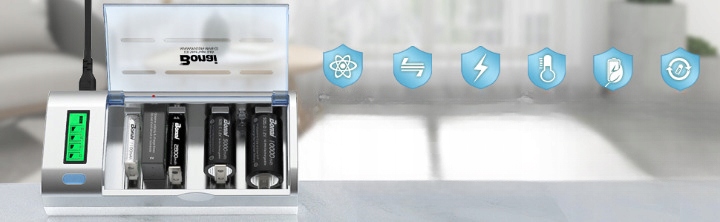 Сверхбыстрая зарядка: заряжает NiMH NiCD CD AA AAA током 1 А, что делает зарядку в 5 раз быстрее, чем обычно. Менее 5 часов для полной зарядки аккумуляторов CD AA AAA и менее 12 часов для полной зарядки аккумуляторов 9 В.