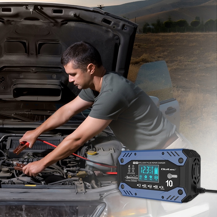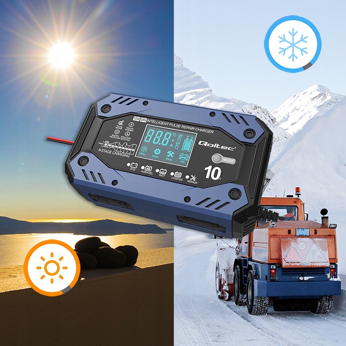 Интеллектуальное зарядное устройство от Qoltec с помощью 9-ступенчатого автоматического режима зарядки со встроенным этапом десульфурации и обслуживания обеспечивает исключительную защиту аккумулятора и обеспечивает максимальную производительность.