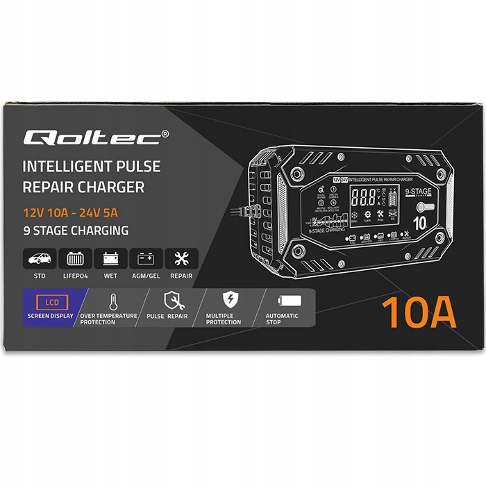Зарядное устройство Qoltec Intelligent STD AGM GEL LiFePO4 | Выпрямитель с функцией ремонта |12-24В |10А | ЖК | 9 - этап зарядки