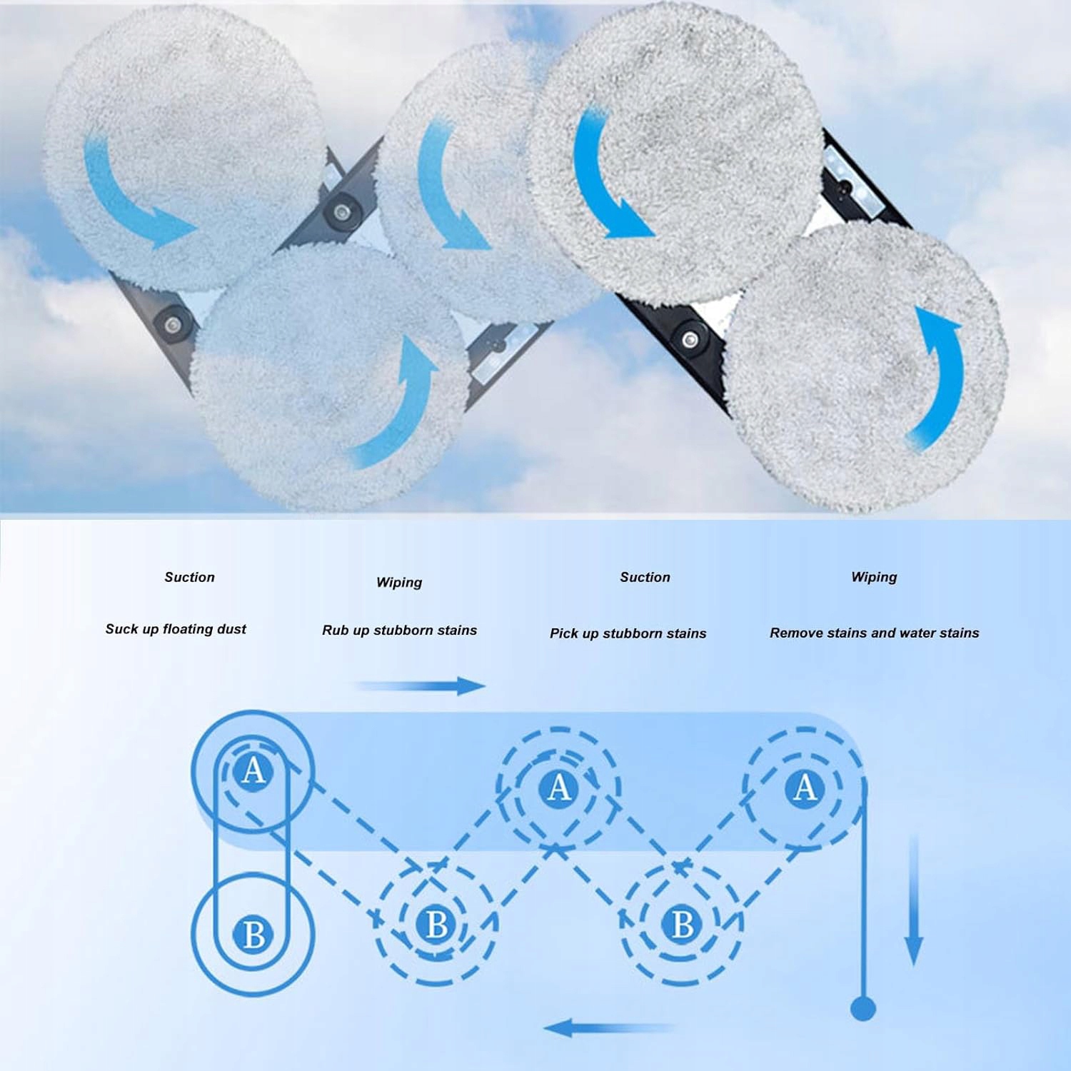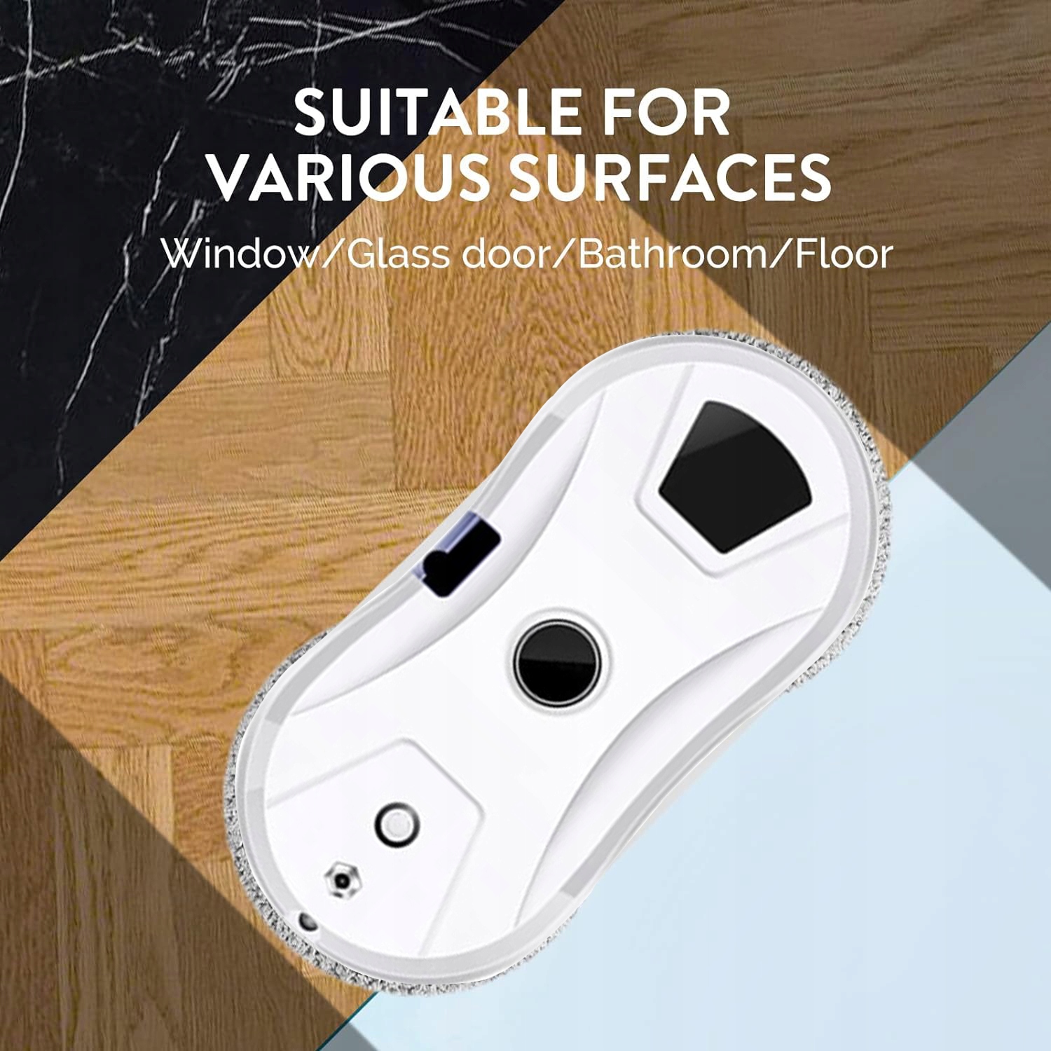 Робот для мытья окон всасывает до 5600 Па, может прилипать к окну; робот для мытья окон во время работы должен быть подключен к электросети, он эффективен только при выключенном питании; Робот для мытья окон подходит для плоских поверхностей, таких как стекло, керамическая плитка, мраморные столешницы и т. д.
