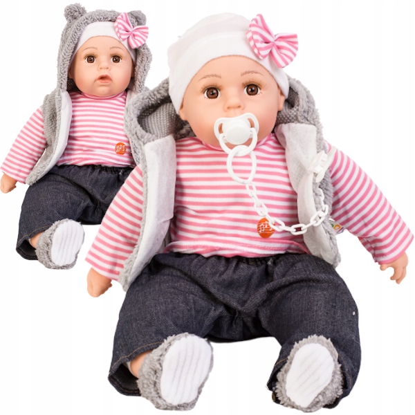 Голова, руки и ноги изготовлены из мягкой резины. , прикрепленный к набивному мягкому туловищу. После нажатия на живот ребенок говорит и поет по-польски. Кукла изготовлена с особой тщательностью из очень качественных материалов. Кукла не стоит одна.