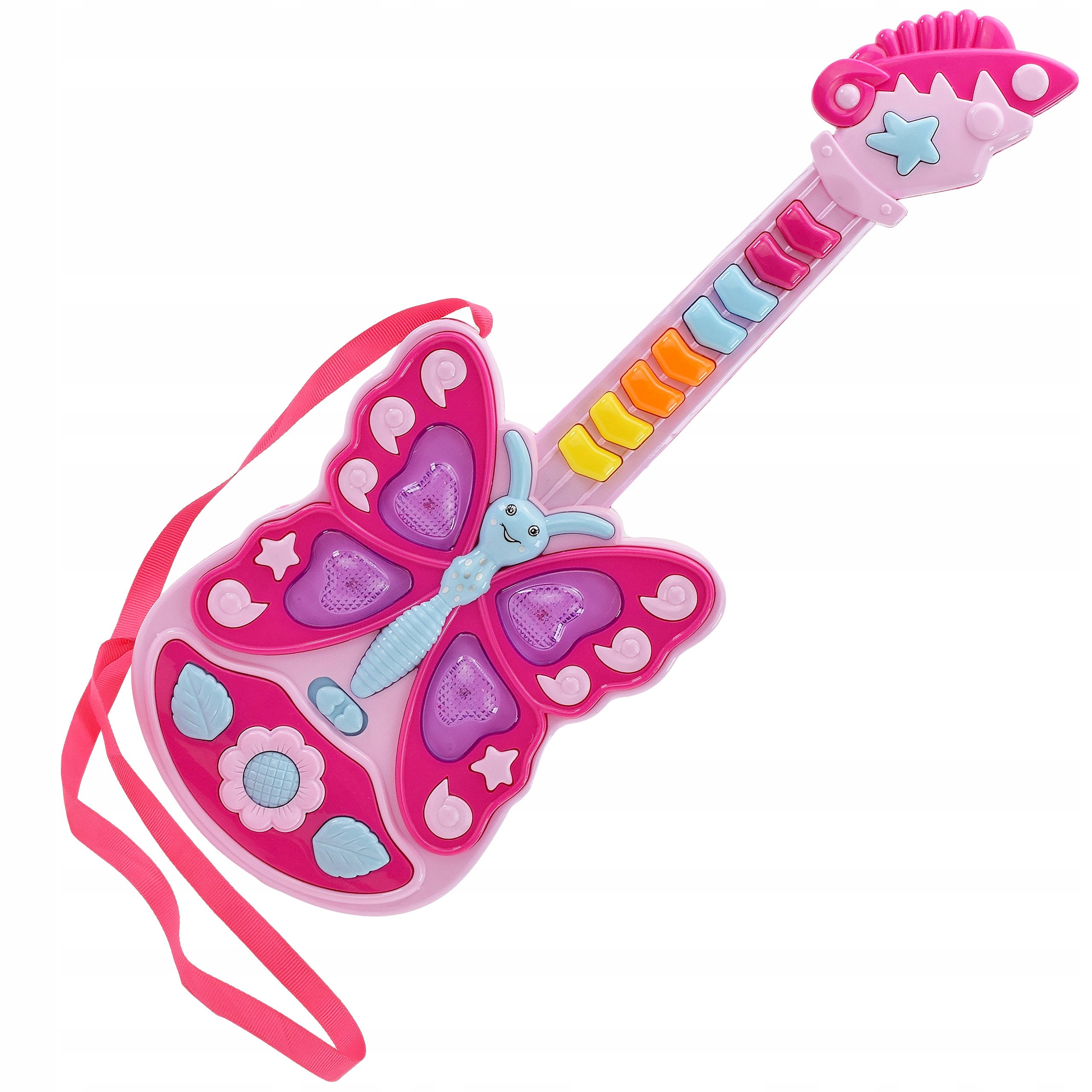- Наша гитара оснащена многочисленными интерактивными функциями, делающими обучение игре на инструменте увлекательным. Он имеет 11 клавиш, при нажатии которых воспроизводятся различные звуки, например аккорды, мелодии и звуковые эффекты. Благодаря этому ребенок может быстро освоить основные приемы игры на инструменте и одновременно развить свое воображение и творческие способности.
