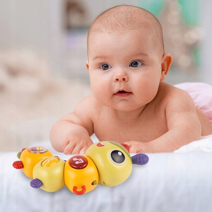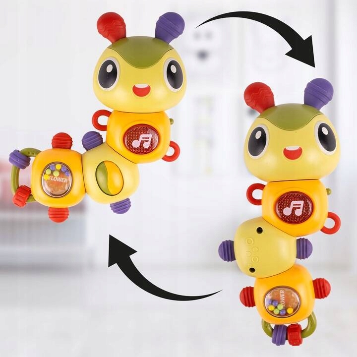 Каждый сегмент гусеницы подвижен и его можно легко вращать. Малыш слышит характерный звук, который не только обеспечивает слуховые ощущения, но и развивает моторику.