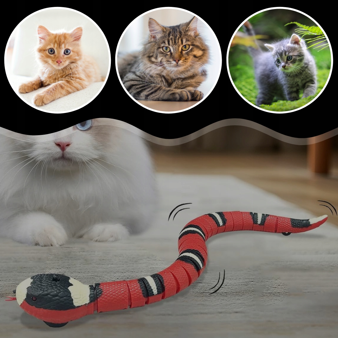 ✔️Беспроблемная игра – Благодаря автоматическому обходу препятствий змея передвигается по всей комнате, что обеспечивает кошке беспрепятственную и интересную игру. развлечения.