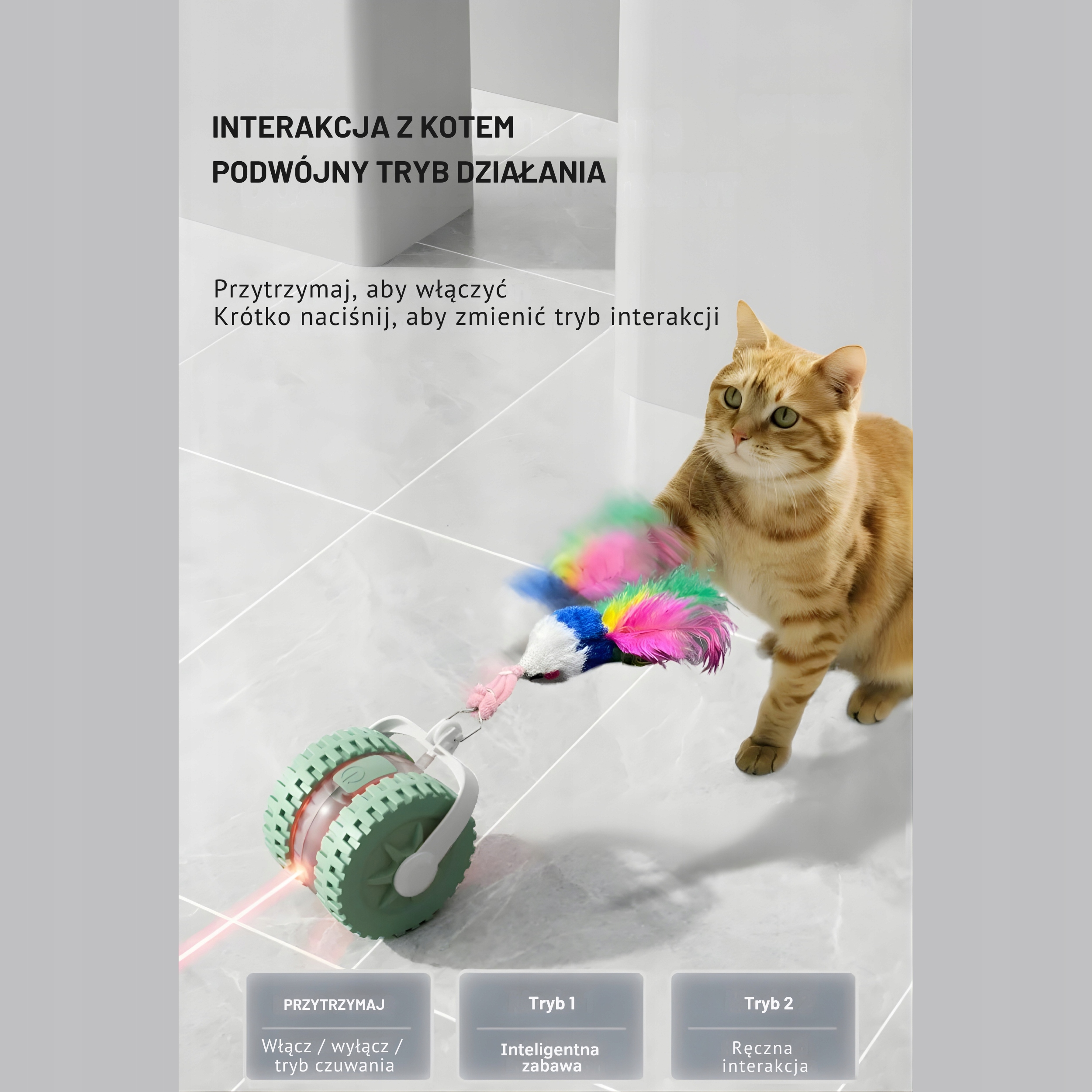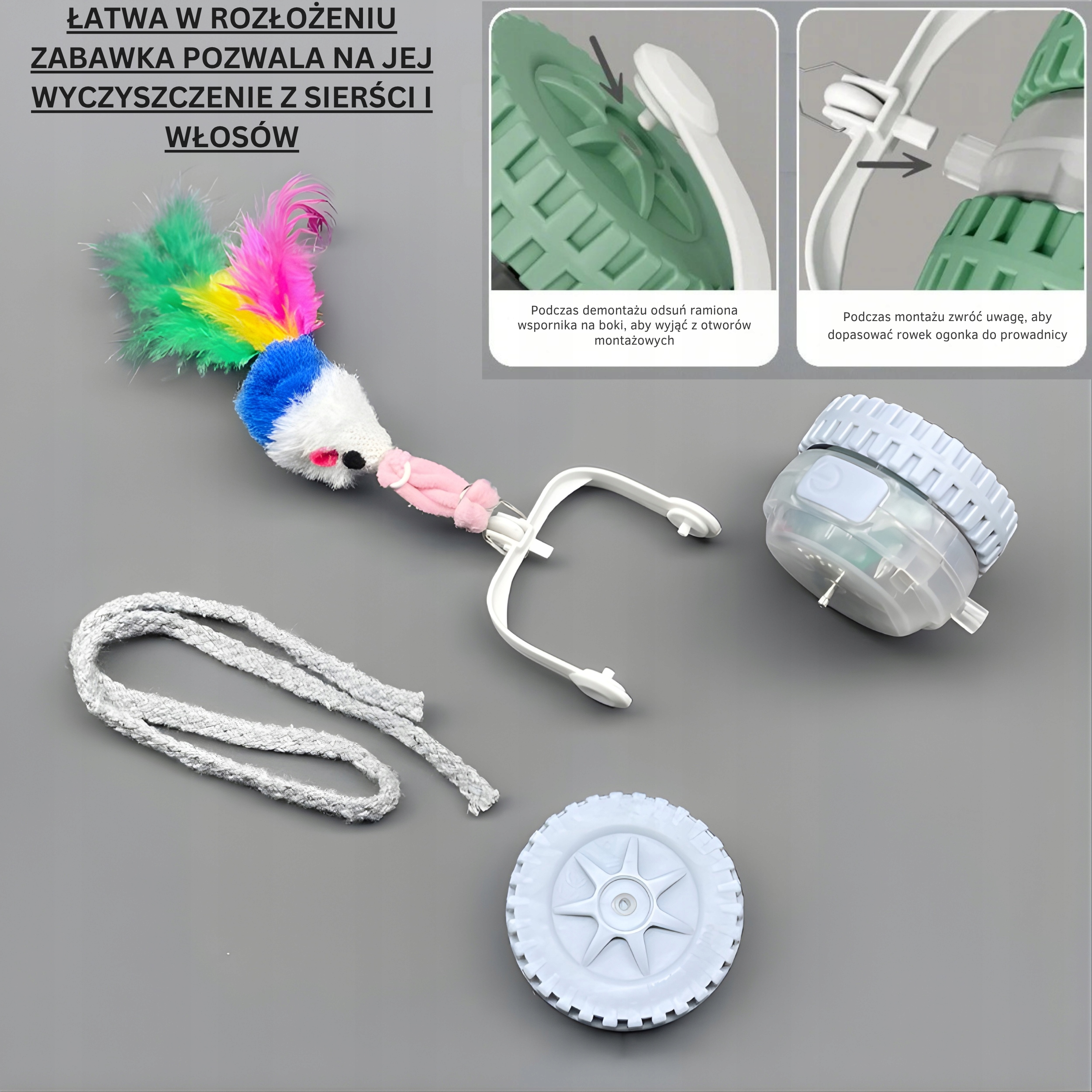 Познакомьтесь с современной интерактивной игрушкой для кошек, которая движется самостоятельно, меняет направление, светится лазером и тянет за веревочку с перьями и плюшевой мышкой. Благодаря автоматическому датчику движения ваш питомец не будет скучать, даже когда у вас нет времени играть.
