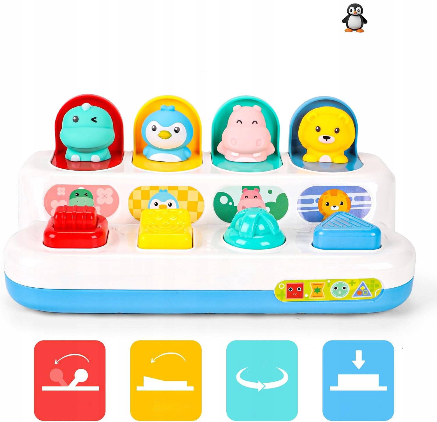 - ✔️Внутри спрятаны зверюшки. Когда ребенок нажимает на переключатель, из него выскакивают милые динозавры, пингвины, бегемоты и львы.