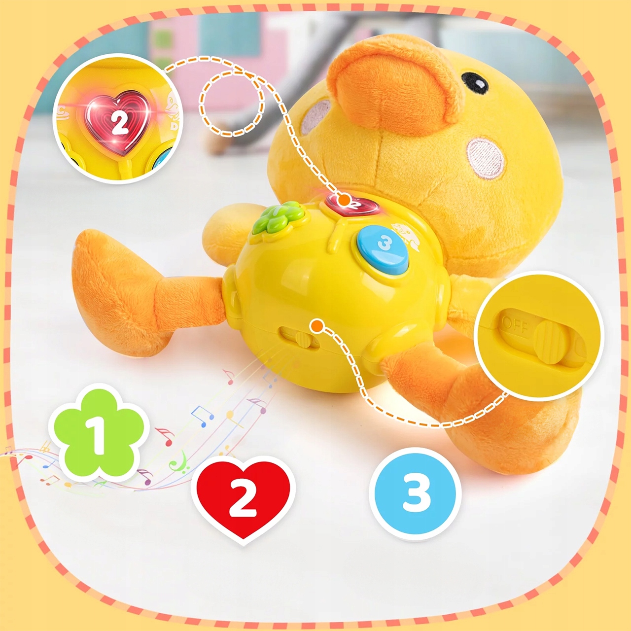 Очаровательная играющая утка станет идеальной игрушкой для малыша от 18 месяцев. Наш питомец издает множество интересных звуков и веселых мелодий, которые непременно заставят вас поиграть. Все веселье сопровождается успокаивающими огнями. Красочные кнопки на передней части игрушки позволяют включать различные интересные звуки, веселые мелодии и звуки.