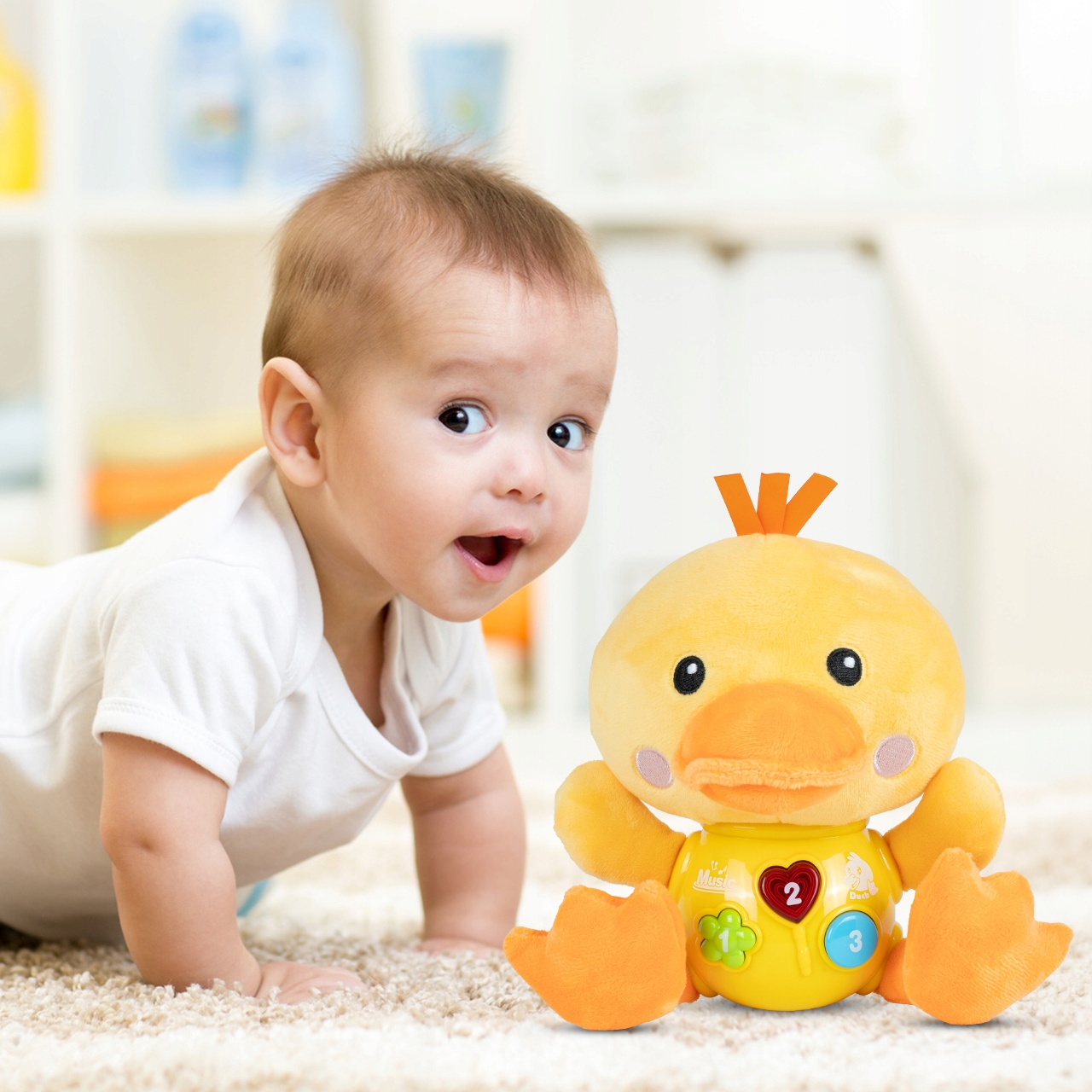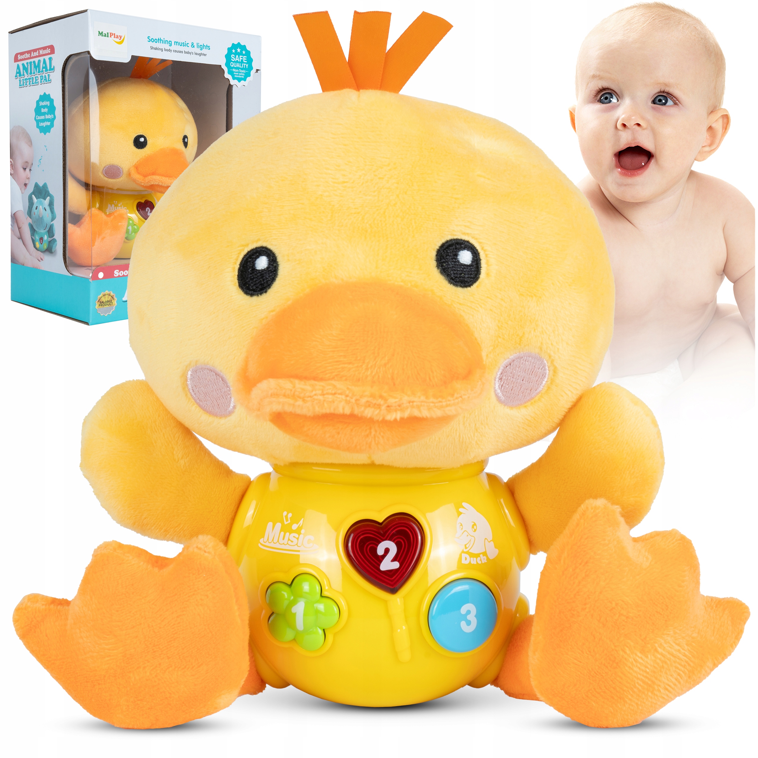 Очаровательная, играющая утка будет идеальной игрушкой для малыша с 18 месяцев. Наш питомец издает много интересных звуков и веселой мелодии, что, безусловно, будет способствовать веселью. Вся игра сопровождается успокаивающими огнями. Красочные кнопки в передней части игрушек позволяют включать различные интересные звуки, веселые мелодии и звуки.