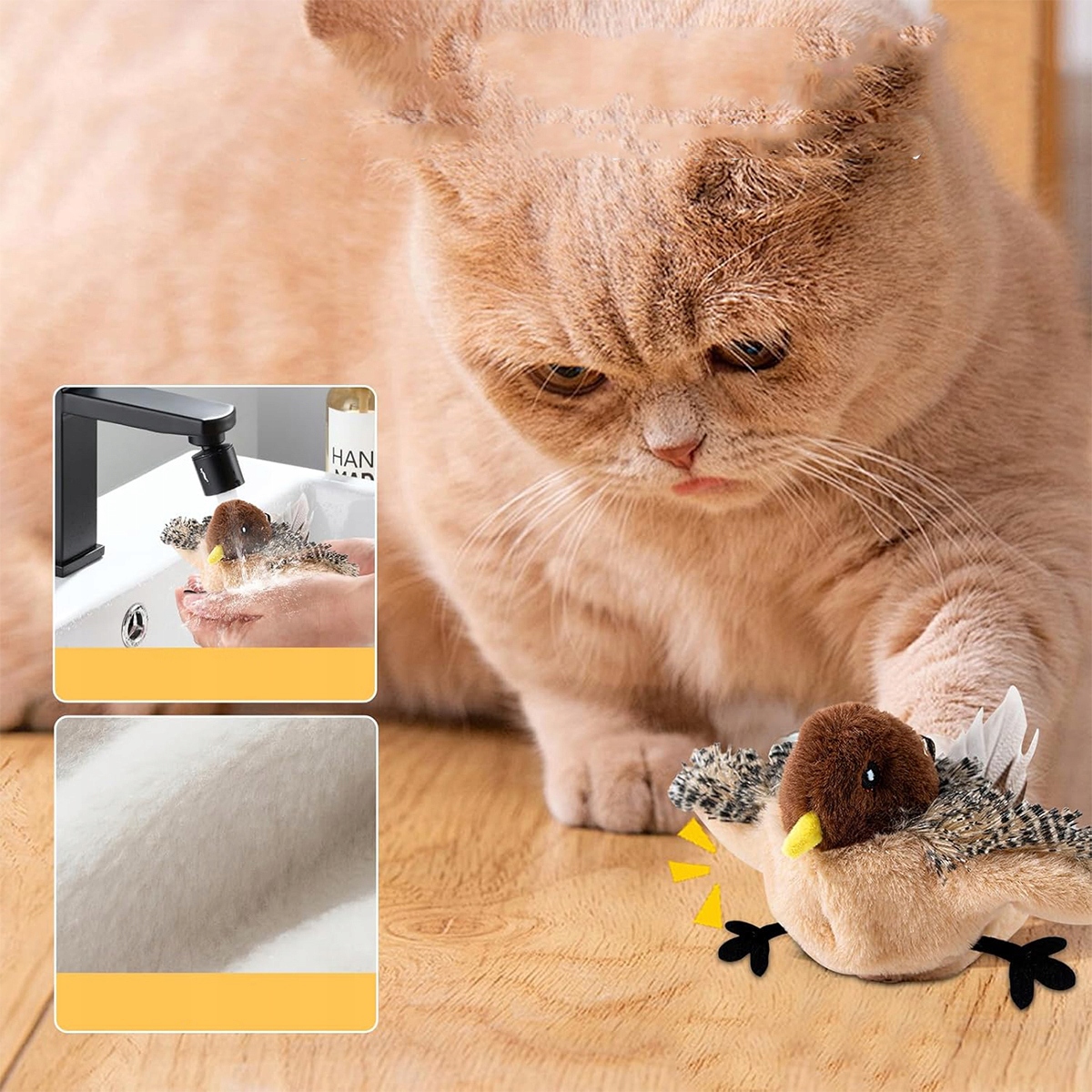 Интерактивная игрушка для кошки, улучшенная моделирование щебетающих птиц воробьев, игрушку из электрической кошки, независимая игра с пультом дистанционного управления, трепещающая игрушка для кошки в форме птиц, заряжаясь через USB-C (желтый коричневый) H1>
