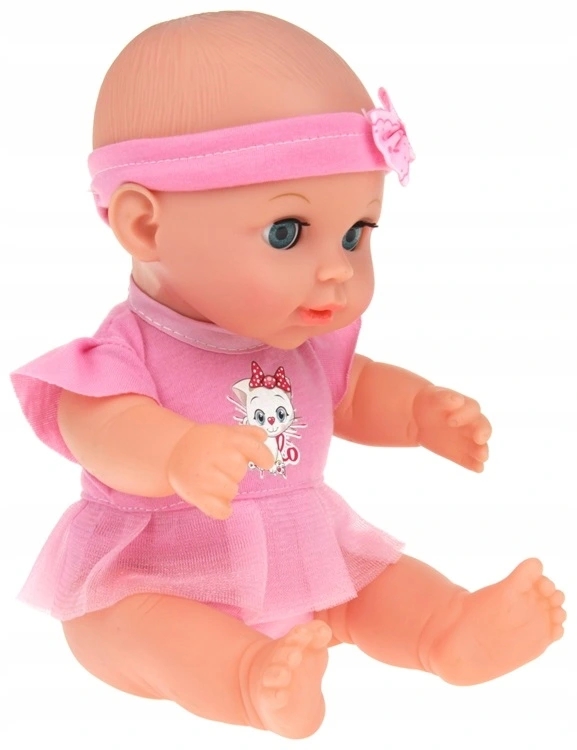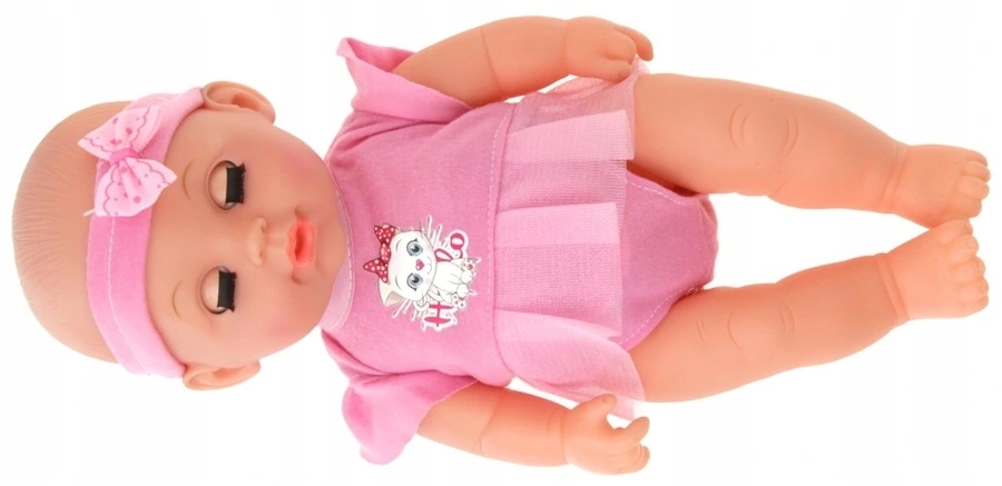 Малышка одета в красочный комбинезон и шапочку. Голова, руки и ноги сделаны из резины, а живот — из пластика. Голова, руки и ноги куклы подвижны. Она может сидеть самостоятельно, а когда вы укладываете ее спать, кукла сама закрывает глаза. Напившись, кукла писает (система перелива). Тогда ей нужно сменить подгузник. Вы также можете приучить ребенка пользоваться горшком. В животе находится звуковой модуль с 10 звуками, например: мама, папа, детский смех, лепет, чмокание или плач.