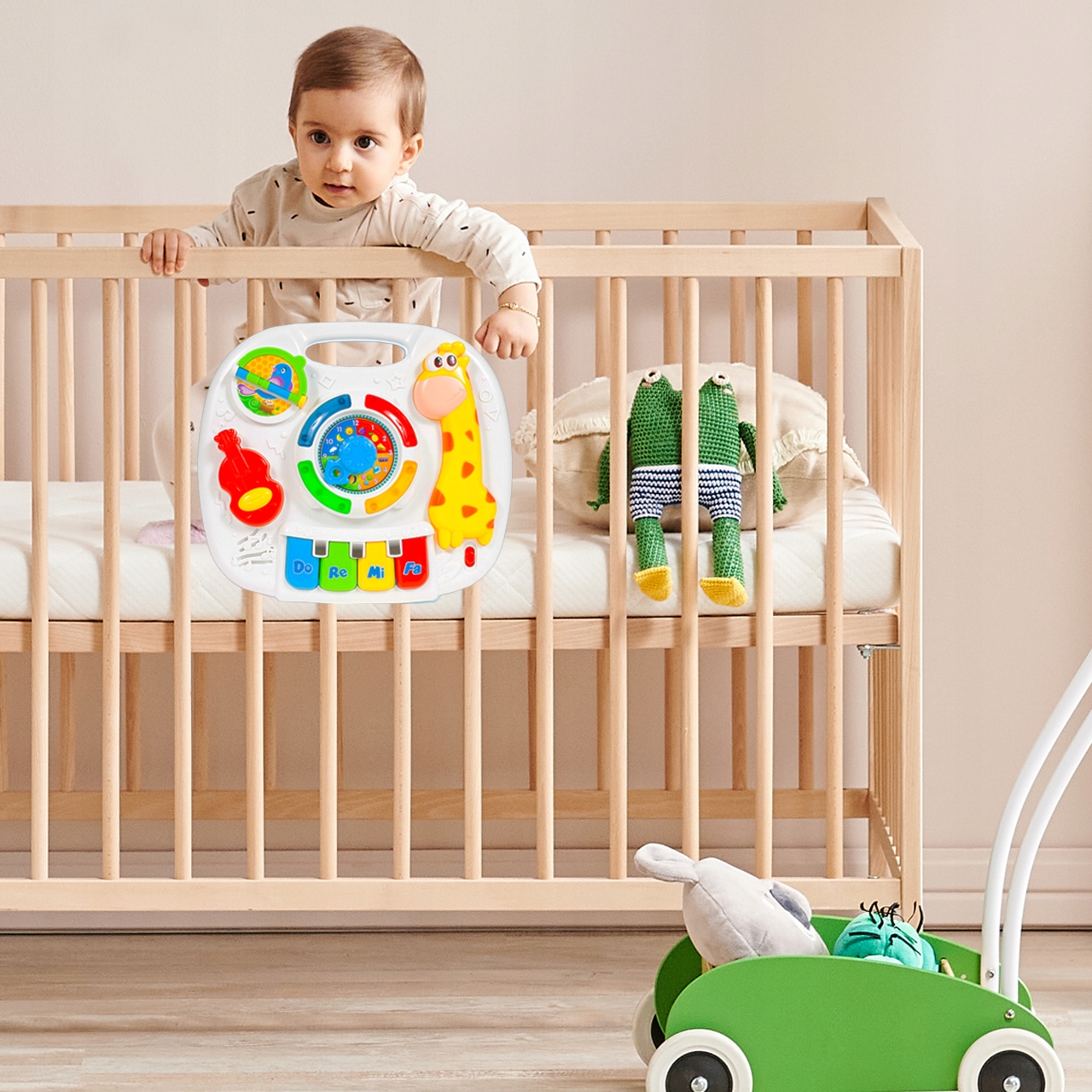 ⭐Стол помогает вашему малышу развиваться посредством игры – с музыкой, светом и цветами. Можно использовать как столик или подвесную панель с регулируемыми держателями для детской кроватки.