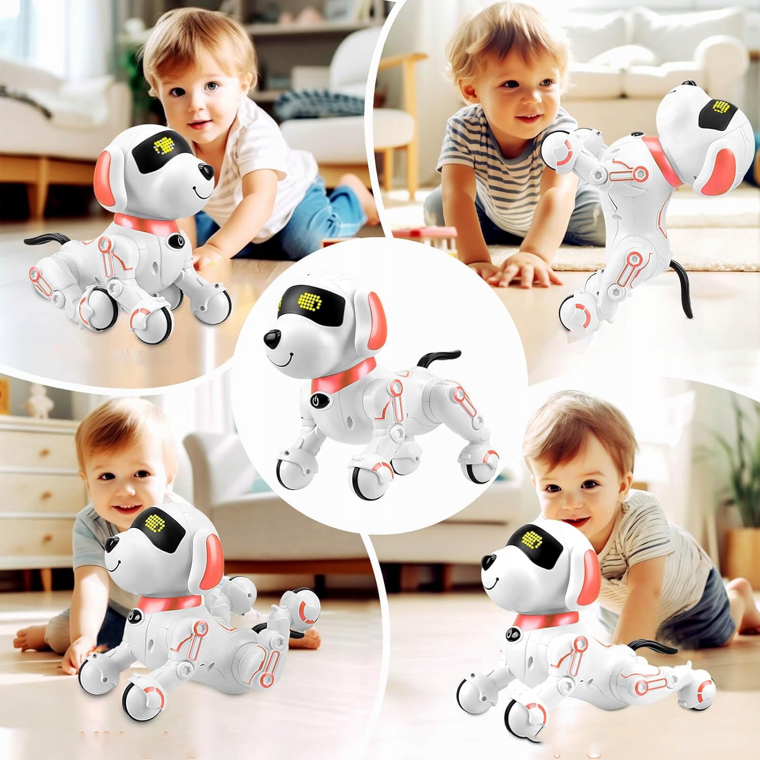 - Наша интеллектуальная собака-робот — многофункциональный компаньон в обучении, который может рассказывать истории, петь детские песенки, танцевать, учить английский язык и имитировать 6 различных звуков животных, предоставляя детям разнообразные возможности обучения и развлечений.