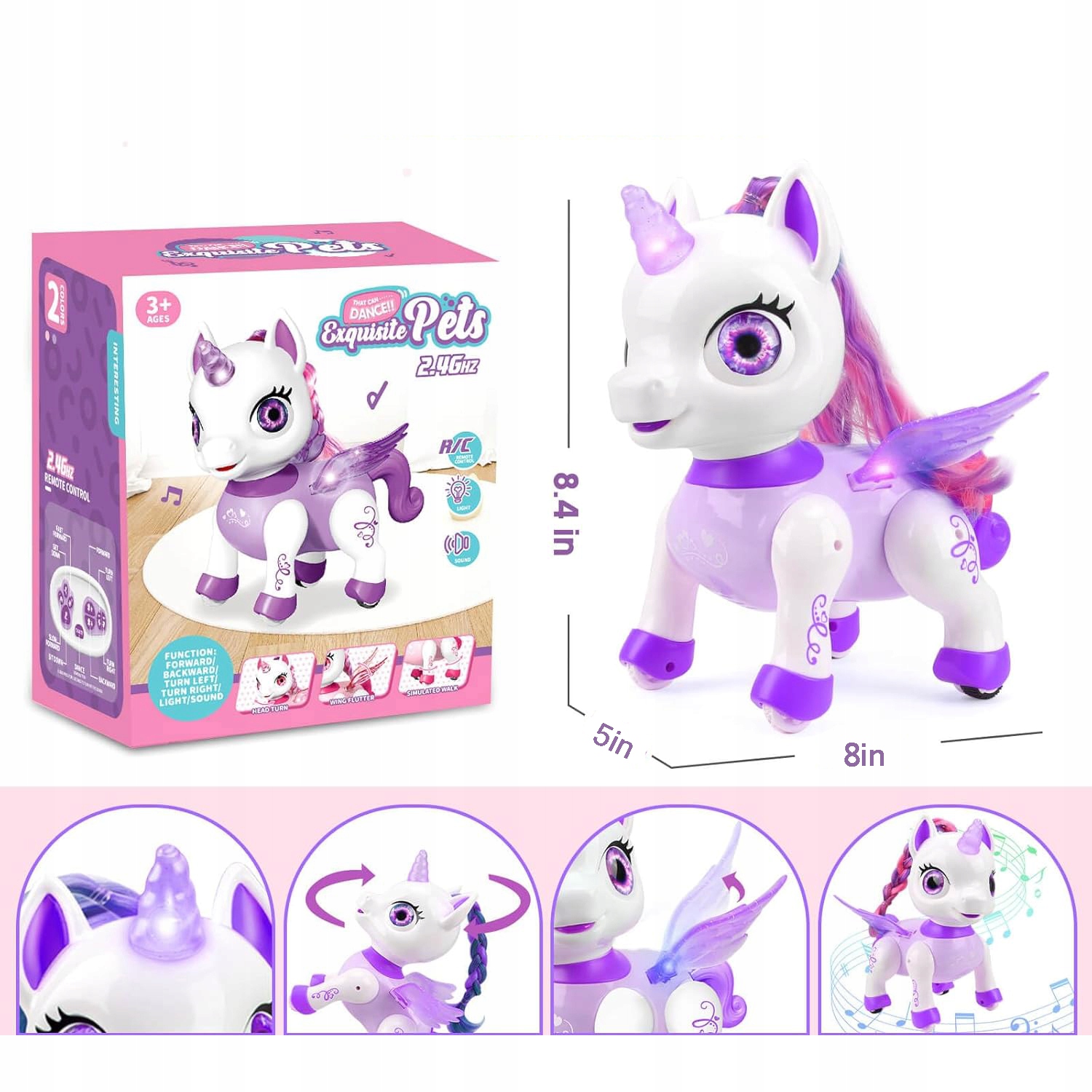 🦄, например, скольжение, бег, поворот, сидеть, стоя и танцевать. Он также играет очаровательную музыку и демонстрирует прохладные огни.