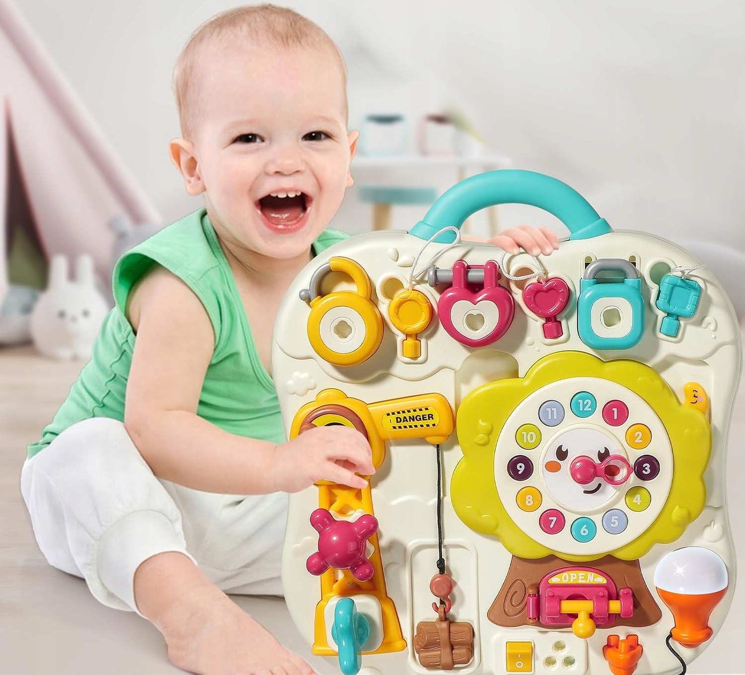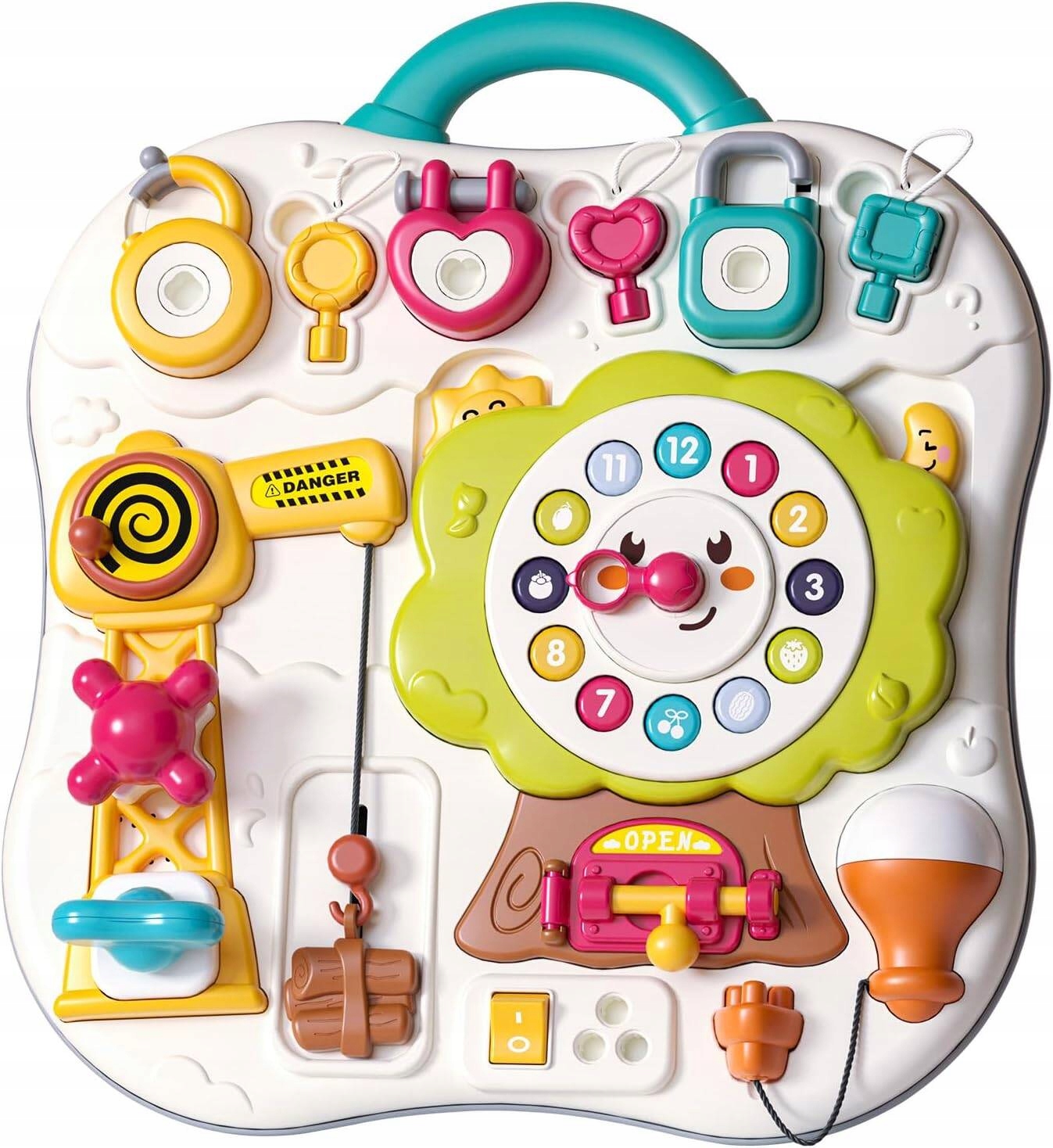 В верхней части игрушки находятся 3 разных замка с ключами, которые дети могут открыть, подобрав соответствующий ключ.
