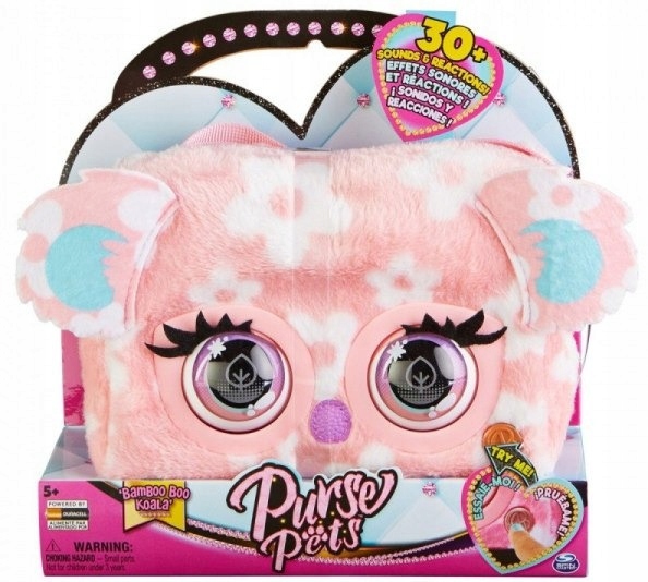 У коалы мягкий плюшевый мех с цветочками. Он реагирует на ваши прикосновения, мигает и издает более 30 звуков и реакций. Сумка имеет регулируемый ремень и глаза в стиле поп-арт. Коснитесь передней части сумки, и вы услышите приятные звуки и действия Purse Pets. Если вы поднесете руку ко лбу, пакет моргнет и отправит вам воздушный поцелуй. В каждой сумке также есть волшебная кнопка, которая позволит вам открыть еще больше игровых возможностей. Purse Pets ответит на вопросы ДА/НЕТ, включит музыку с подиума или включит звук камеры и аплодисменты публики. Собирайте сумки Purse Pets и создавайте уникальные стили.