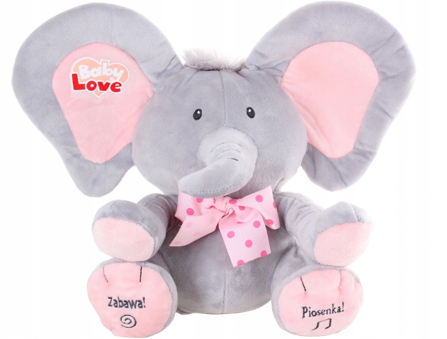 ✨ После нажатия кнопки на правой ноге ВЕСЕЛО слоненок разговаривает и играет в прятки с ребенком, закрывая ушами глаза и разговаривая с ребенком: