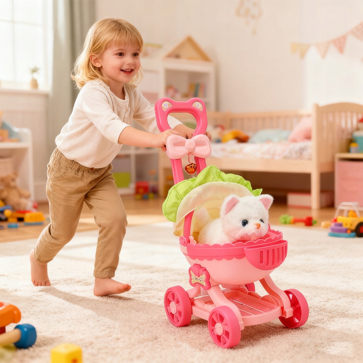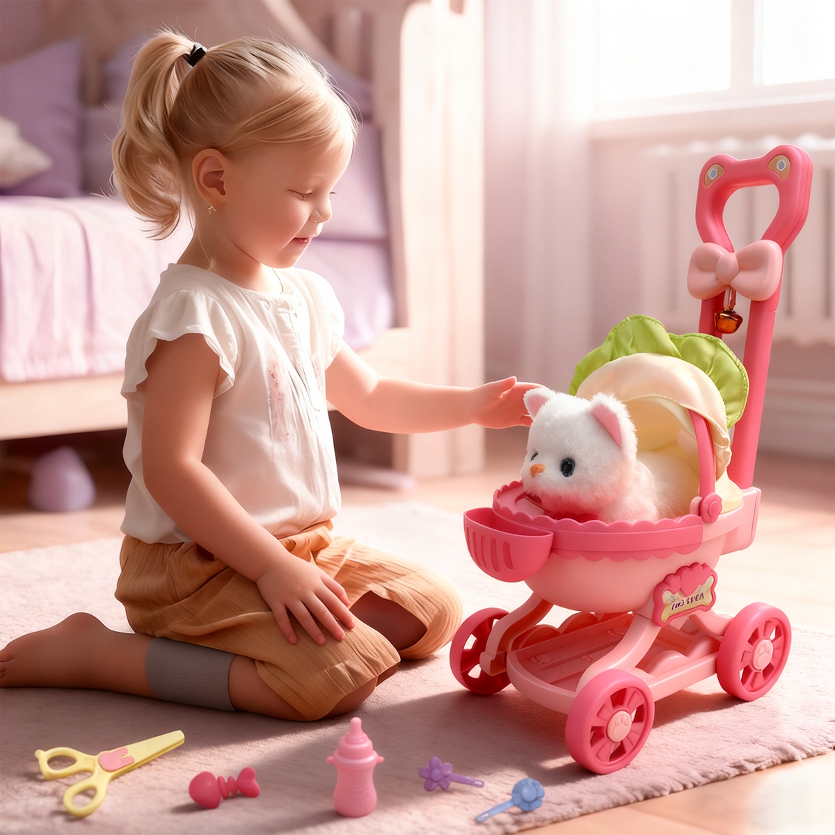 💗Коляска для куклы и игрушка для ухода за домашними животными. Коляска изготовлена из высококачественных материалов с гладкими и фактурными краями. Легко собирается, позволяет брать питомца с собой и заботиться о нем разными способами. Дети могут легко брать своих кошек с собой в приключения на свежем воздухе. Набор для ролевых игр «Уход за домашними животными» позволяет заниматься такими увлекательными занятиями, как уход за кошками и их кормление, развитие у детей чувства ответственности и сопереживания.