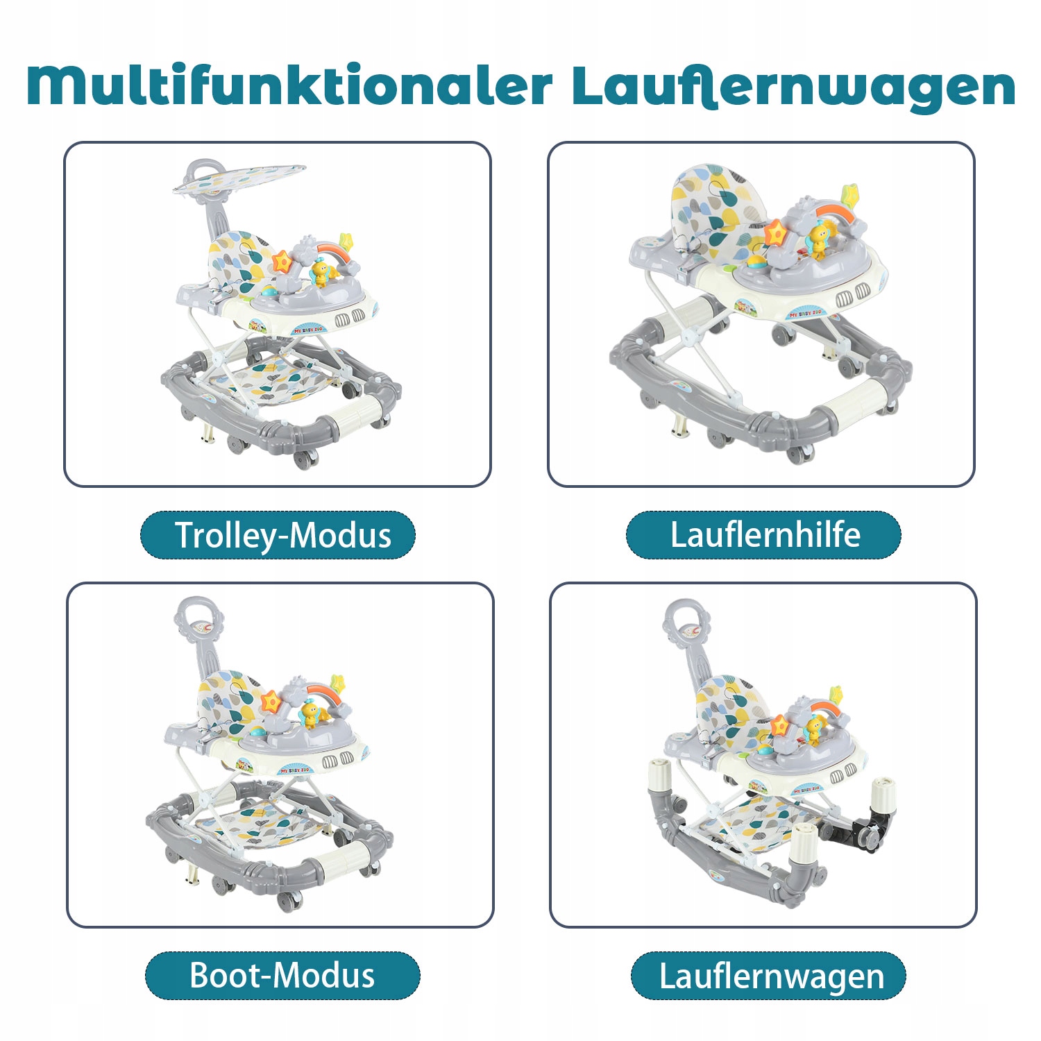 Многофункциональные ходунки 4 в 1. Ходунки предлагают четыре различных функции: режим коляски, ходунки, режим лодки и ходунки для удовлетворения потребностей младенцев. Подходит для детей в возрасте от 6 до 18 месяцев с максимальным весом 15 кг.