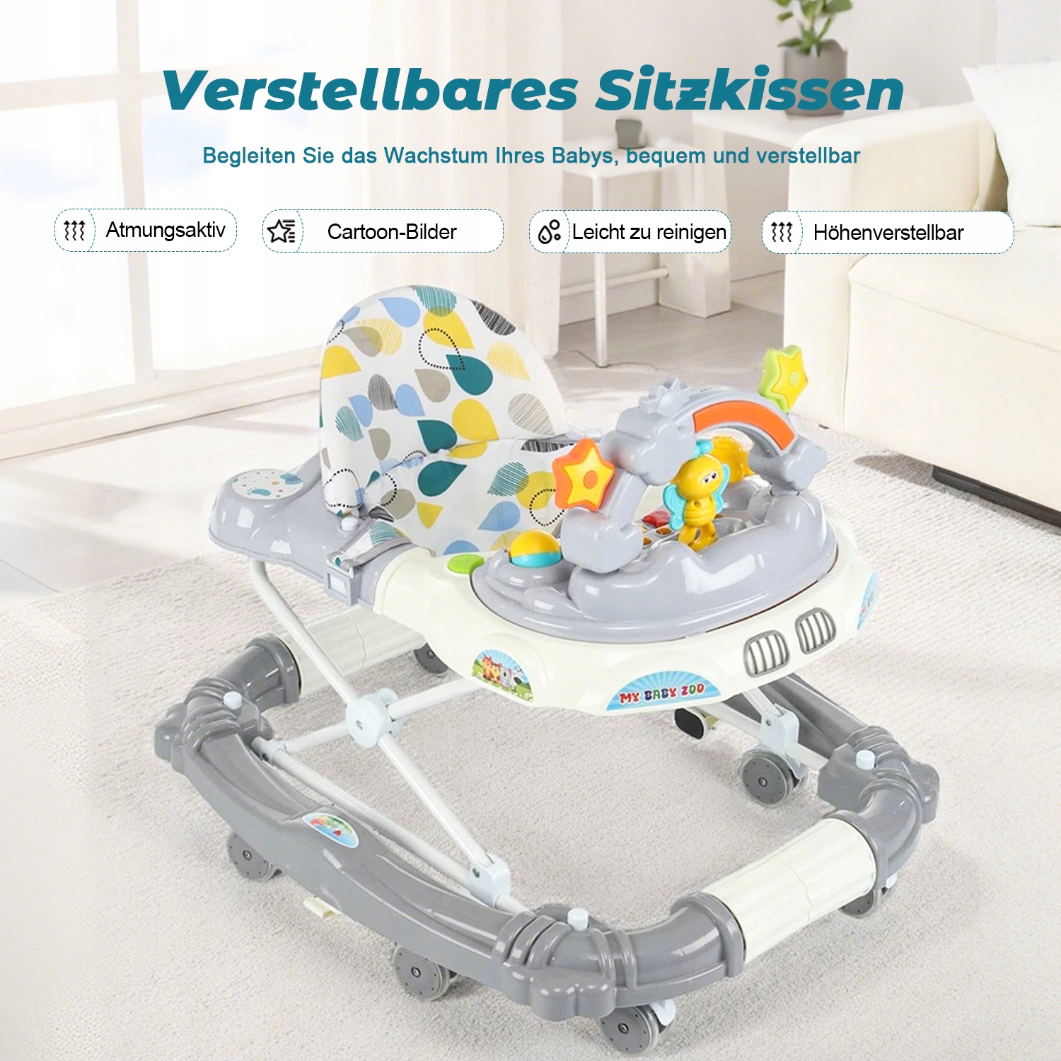 ПОЛНОСТЬЮ РЕГУЛИРУЕМЫЙ: ходунки полностью складываются, что делает их чрезвычайно компактными. Благодаря регулируемой высоте сиденья эти ходунки растут вместе с вашим ребенком, всегда обеспечивая оптимальный комфорт. Эти ходунки идеально подходят для любого дома, независимо от того, большое или маленькое пространство.