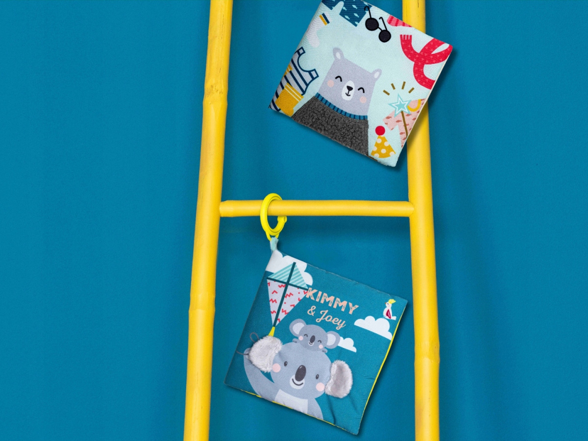 - В поисках Джоуи – это забавная сенсорная мягкая книга для коляски.