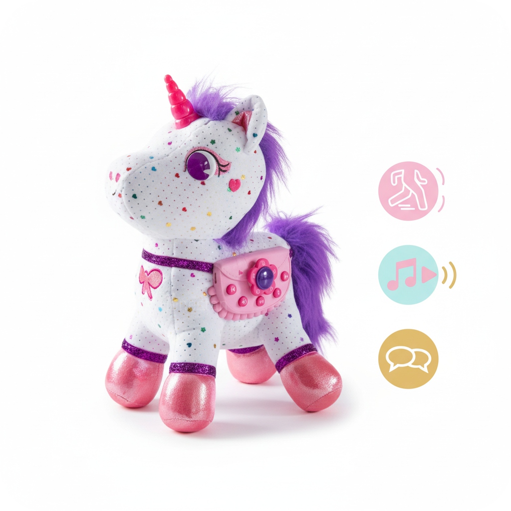 • Реакция на прикосновения и движения - единорог реагирует звуками и анимацией, повышая вовлеченность ребенка.