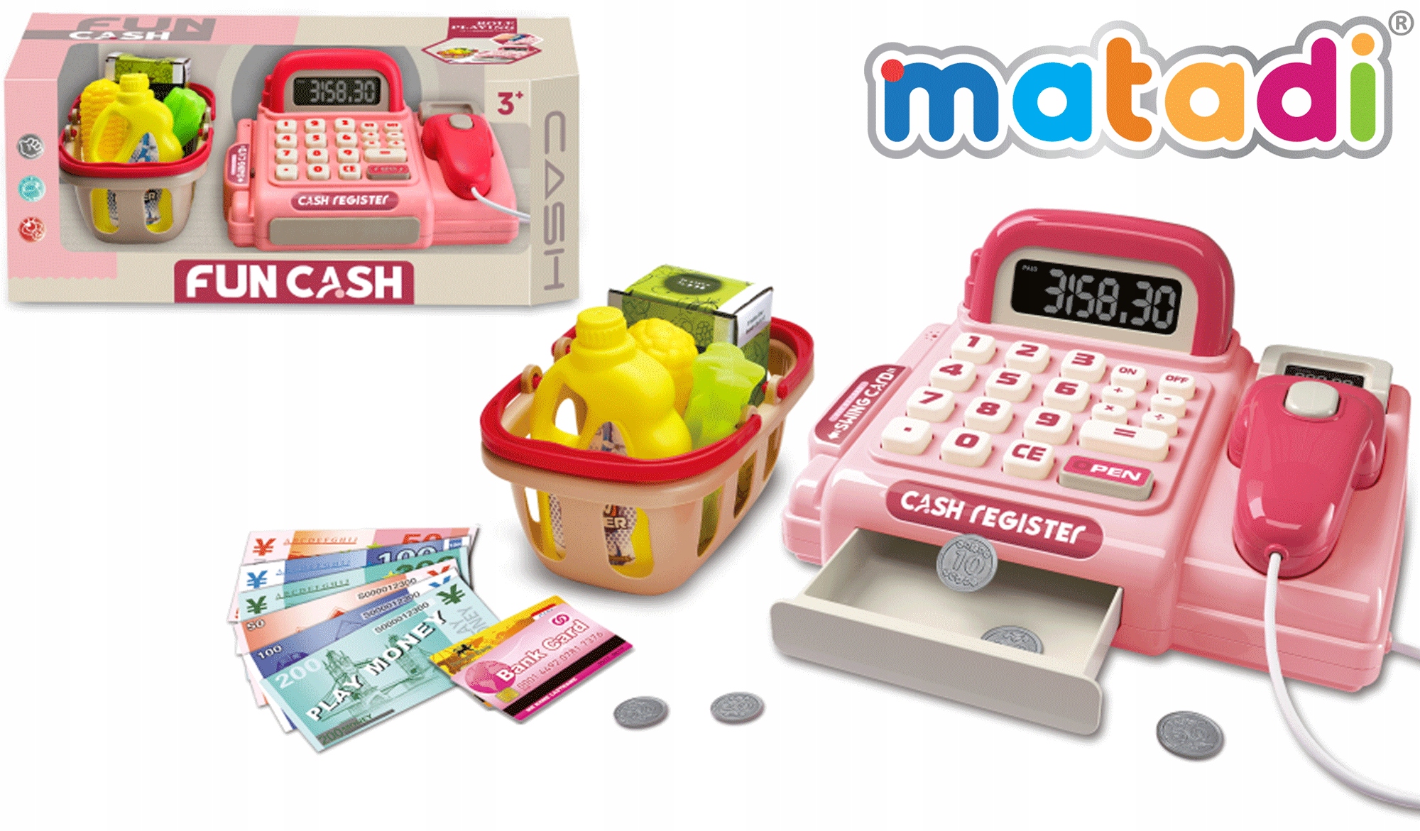 Кассовый аппарат имеет полностью функциональный дисплей с калькулятором , чья клавиатура очень разборчива. Этот электронный кассовый аппарат также был оснащен сканером кодов с помощью света и звукового эффекта, чтения карты с звуковым эффектом. Кассовый регистр находится Big Grey Open Button, которую можно открыть с помощью денег . Набор также включает в себя банкноты, монеты и банковскую карту для еще более интересного веселья