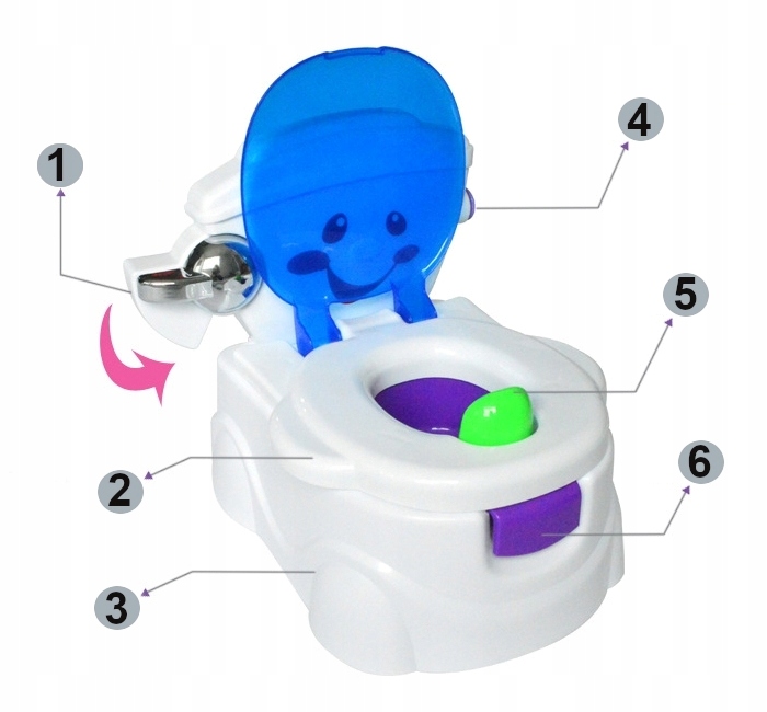 Горшок оснащен блестящим подвижным сливом, держателем для туалетной бумаги, съемным контейнером и складной крышкой. Каждый раз, когда ребенок воспользуется горшком, он будет вознагражден двумя веселыми песенками и несколькими ободряющими предложениями на польском языке.