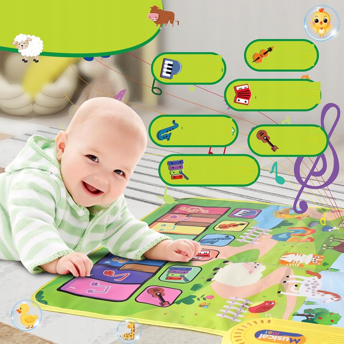 ✅ Фортепианная часть с 8 клавишами и 6 звуками инструментов (фортепиано, скрипка, труба, аккордеон, вибрафон, гитара) и 8 клавишами с животными (кошка, собака, утка, птица, корова, овца, лошадь, курица).