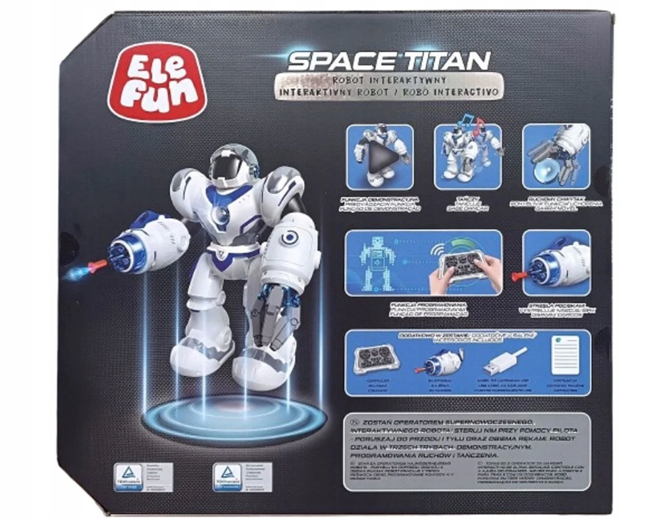Интерактивный робот с дистанционным управлением Space Titan от Elefun предназначен для детей от 3 лет. возраст. Робот имеет высоту около 36 см и может быть запрограммирован на до 50 движений, которые он будет выполнять последовательно. Игрушка «говорит» на языке роботов, может ездить вперед и назад, ходить вперед и назад, танцевать, стрелять (8 различных видов стрельбы), хватать и двигать руками. Роботом можно управлять с помощью прилагаемого пульта дистанционного управления с радиусом действия до 5 метров, питающегося от 2-х батареек типа ААА 1,5В (в комплект не входят). Робот не требует аккумуляторов, в нем имеется встроенный литий-ионный аккумулятор напряжением 3,7 В емкостью 500 мАч, который заряжается с помощью кабеля USB-USB-C, входящего в комплект игрушки. Для полной зарядки роботу требуется до 2 часов.