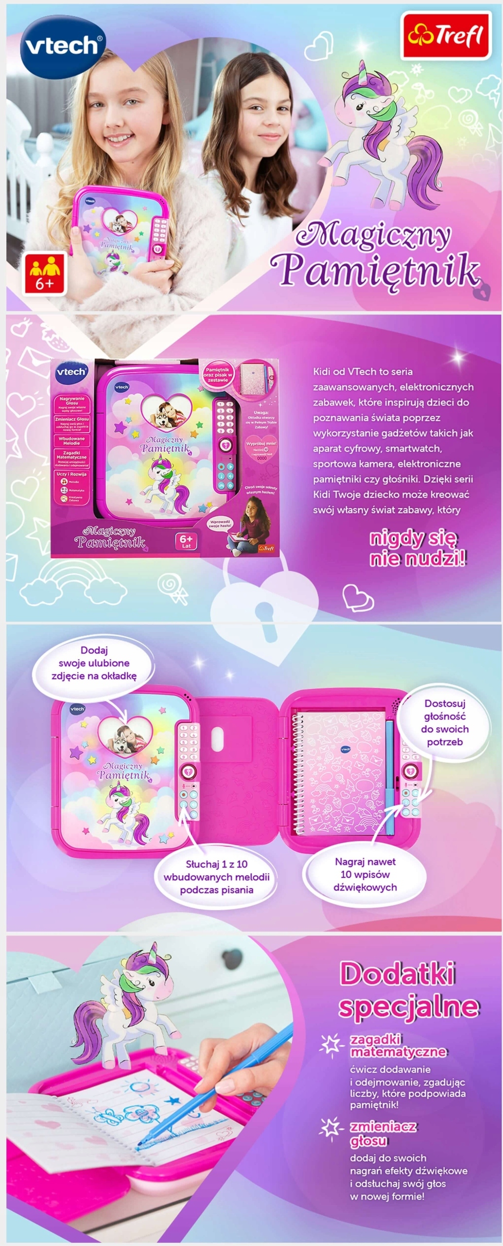 Волшебный дневник бренд VTech - отличная ноутбука, в которой вы можете сохранить секреты и защитить их от чтения с помощью пароля! У обложки есть место для фотографии владельца. Волшебный дневник обладает встроенной способностью записывать звуки и воспроизводить их. С помощью номеров, размещенных спереди, вы можете сохранить пароль в дневник и воспроизвести голосовые записи. Дневник также имеет функцию голосового модификатора и математическую игру «Найдите цифру». Внутри есть ноутбук со специально обозначенными местами для секретов и данных владельца. Рядом с ноутбуком внутри есть особое место для красочной ручки, которая включена в набор. Под записной книжкой есть специальное хранилище сокровищ.