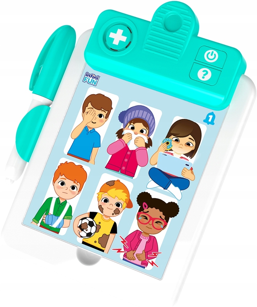 Планшет - это интерактивная игрушка, которая напоминает карту пациента. Ребенок может чувствовать себя настоящим врачом, играя и обучаясь. В таблетке представлены цифры пациентов, которые страдают от различных заболеваний. Планшет издает звуки. Специальная ручка прикреплена к планшету, благодаря которой ребенок может отметить правильные поля на карте пациента.