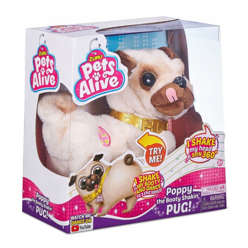 Этот мопс любит танцевать! Очаровательная плюшевая фигурка может двигать головой и попкой, а также вращаться на 360°. Он также играет три замечательные песни, от которых сразу же хочется танцевать. Игривая энергия Поппи, очаровательные движения головы и бедер доставят массу радости и веселья всей семье! Нажмите кнопку музыки и посмотрите, какая милая и энергичная эта уникальная собака.