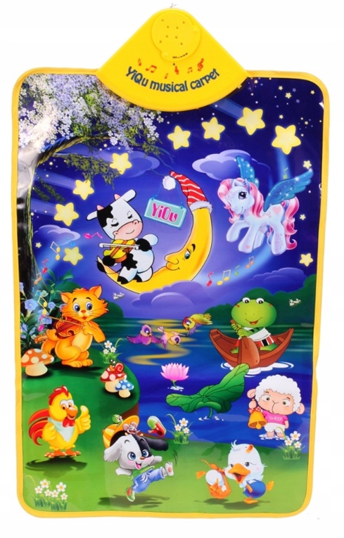 Благодаря интерактивному коврику, нажав на заданное животное, ребенок услышит его звук, что доставит ему невероятную радость. На развивающем коврике изображены различные животные, например, корова, кошка, лягушка, утка, петух, ягненок, пони.