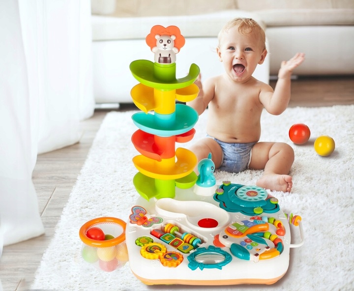 Этот стол с различными элементами, такими как шариковая горка, пианино, шестеренки и многое другое, открывает для вашего ребенка бесконечное приключение, полное веселья и открытий. Каждая игрушка таит в себе ценный образовательный потенциал, учит малыша логически мыслить, координировать свои действия и познавать мир посредством игры.